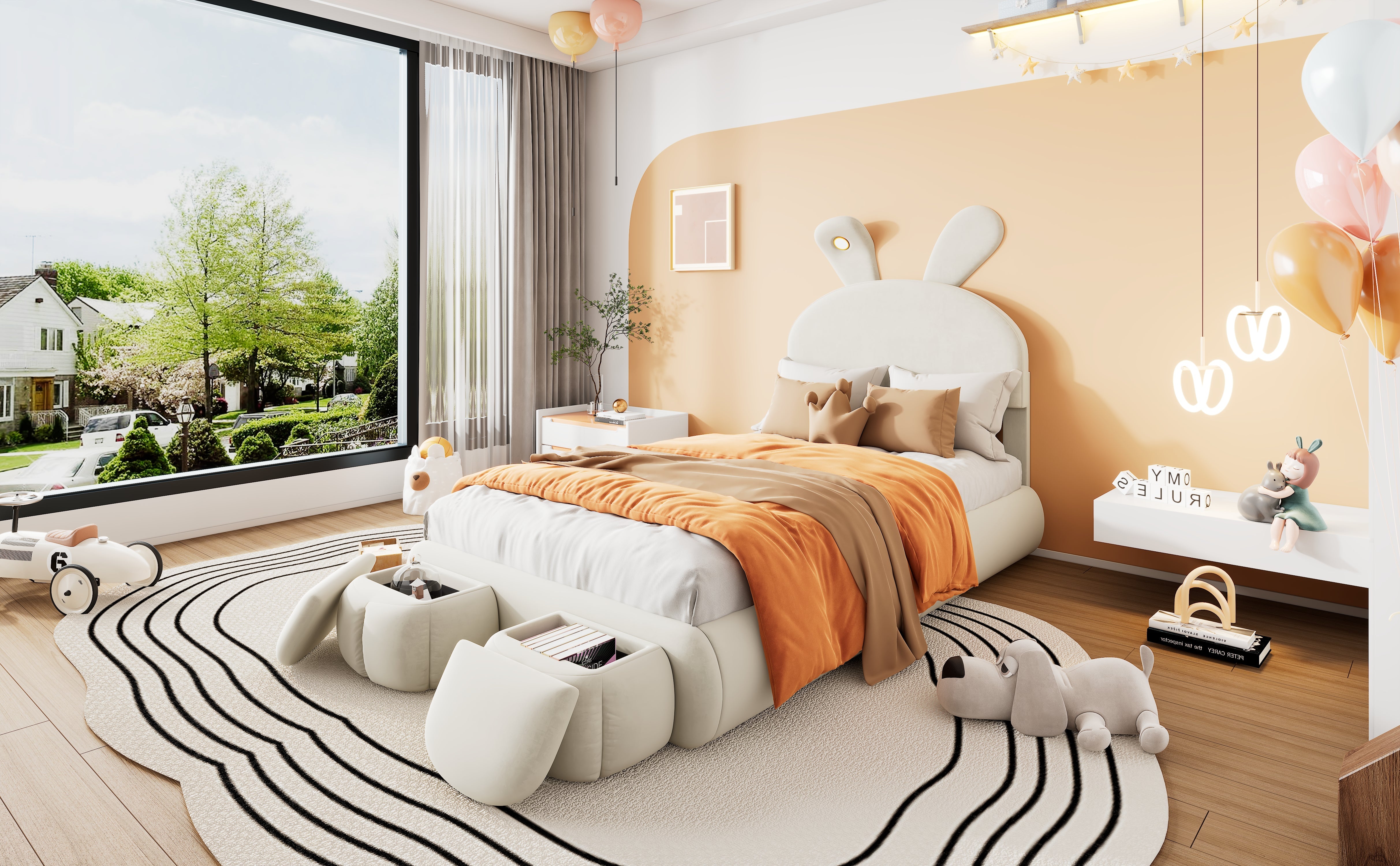 This soft bunny ear bed is upholstered in beige velvet, creating a playful and cozy atmosphere. It includes two round cartoon storage ottomans that can be flexibly placed at the foot of the bed or anywhere in the room. The bunny ears are a unique design element, with one ear equipped with an LED light whose brightness is adjustable and emits a warm yellow glow. The bed is constructed with a metal frame and sturdy wooden slats for added stability and durability. The sleeping area is 90x200cm, providing ample space for a comfortable night's sleep.