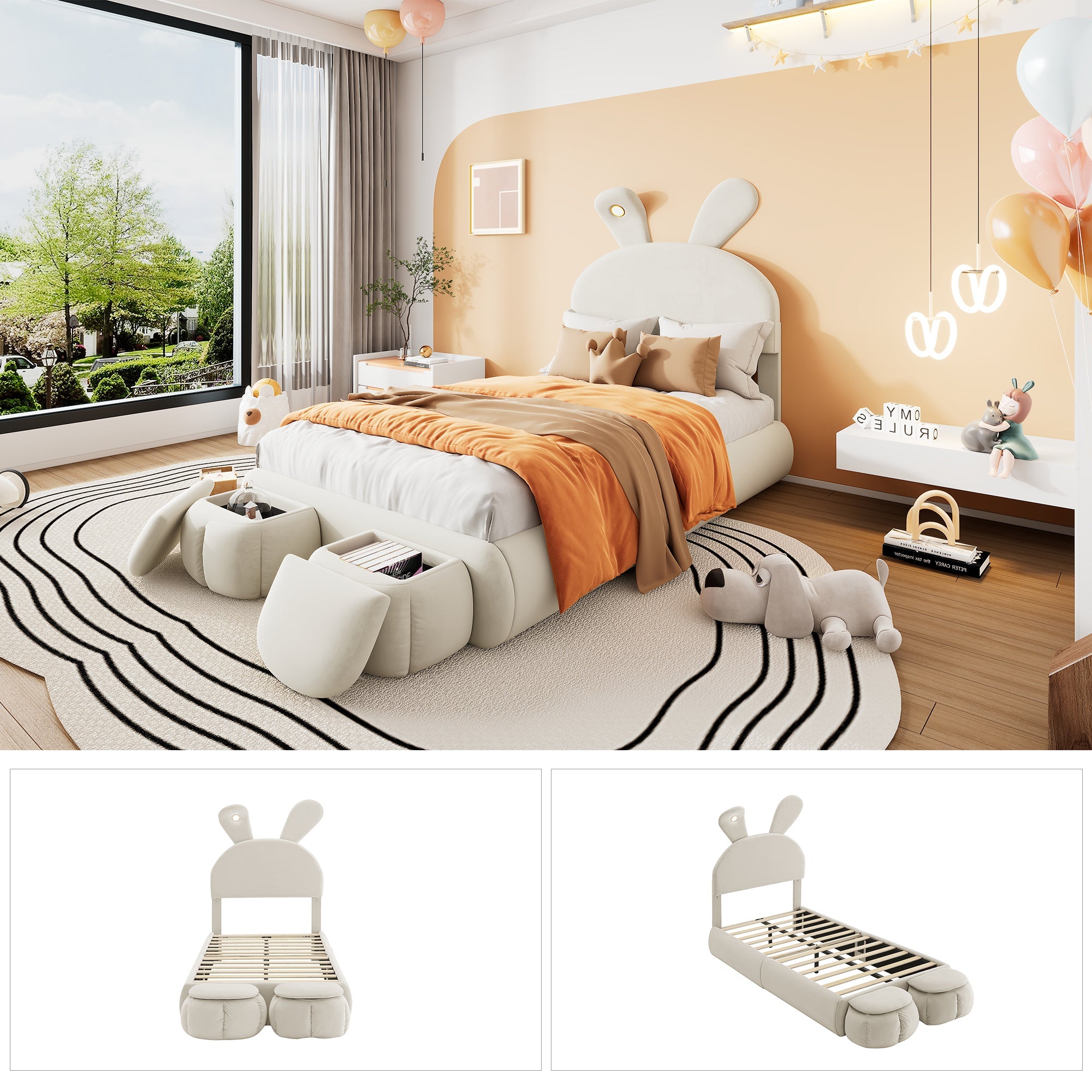 Upholstered Single Bed, Bunny Ears LED Light Storage Stools, Velvet Beige, 90x200cm
