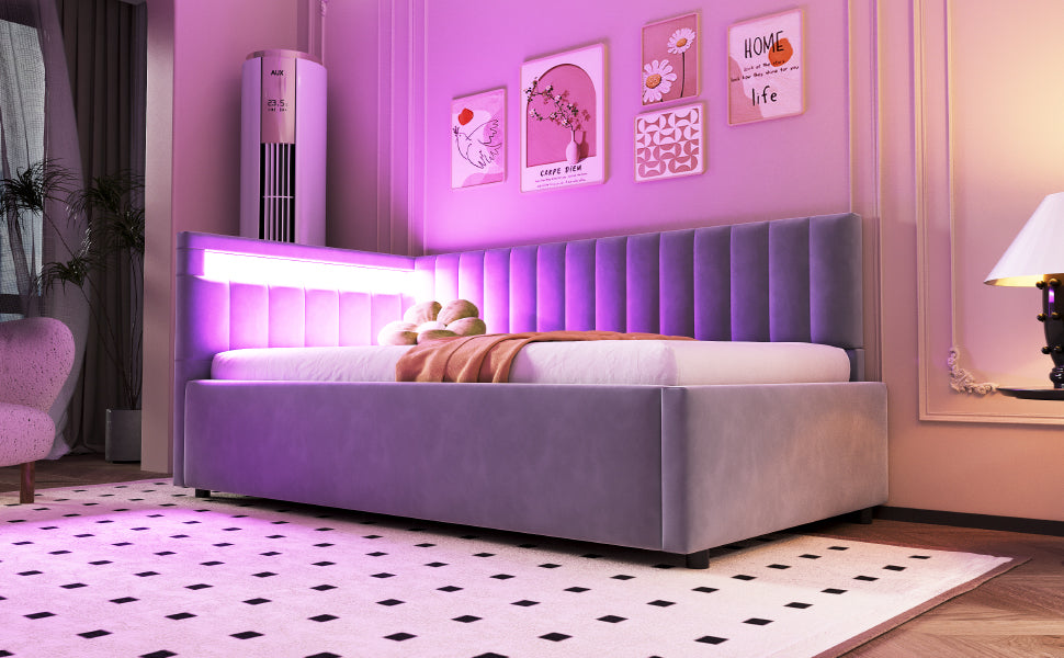 Upholstered Sofa Bed 90x200 with LED Lighting & Hydraulic Storage, Light Grey Velvet