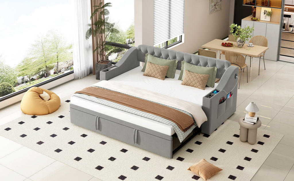 Upholstered Sofa Bed with USB Charging Port, Storage, Slatted Frame, Velvet Fabric, Grey