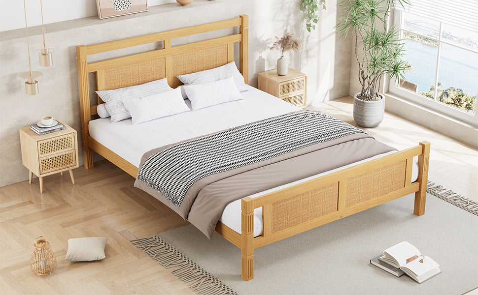 Wooden Bed, 4ft6 Double (135x190cm), MDF with Rattan Paper, Wood Colour