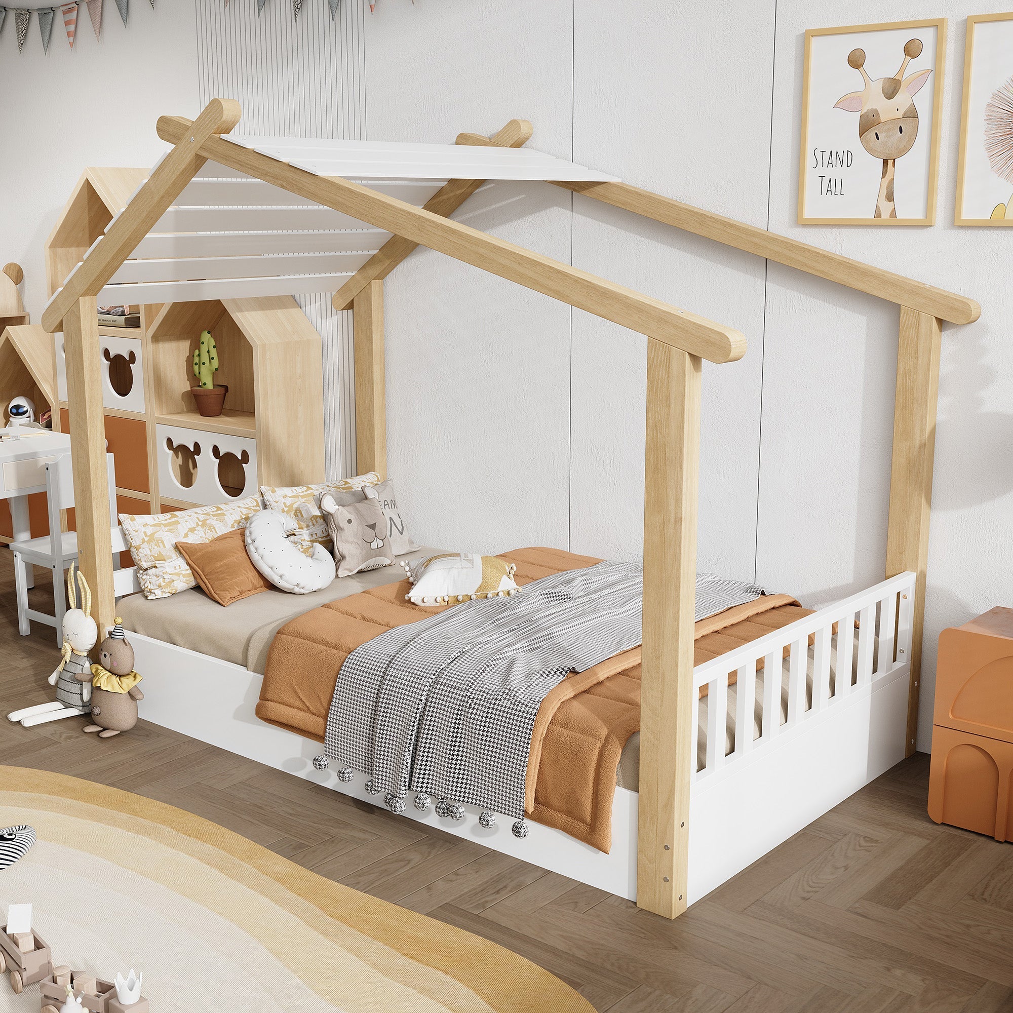 Wooden Bed, House Design Single with Slatted Frame, Pine & MDF White & Natural