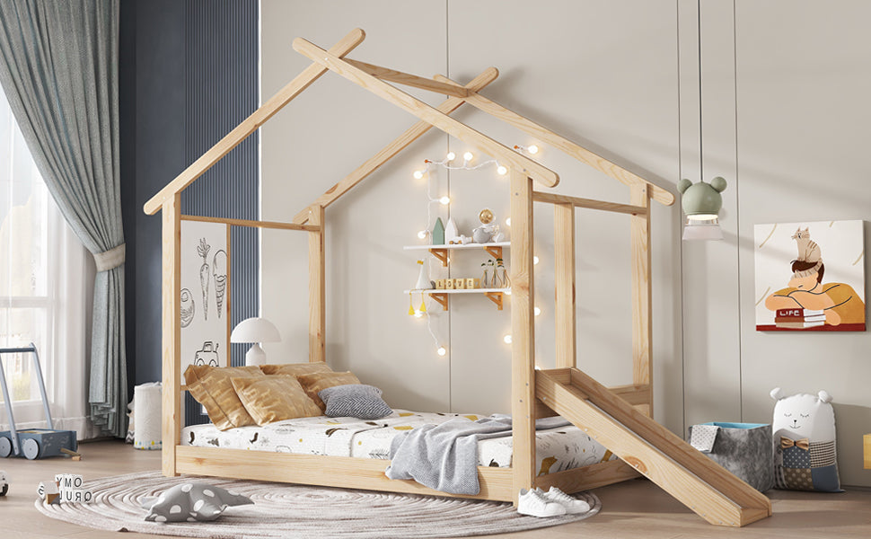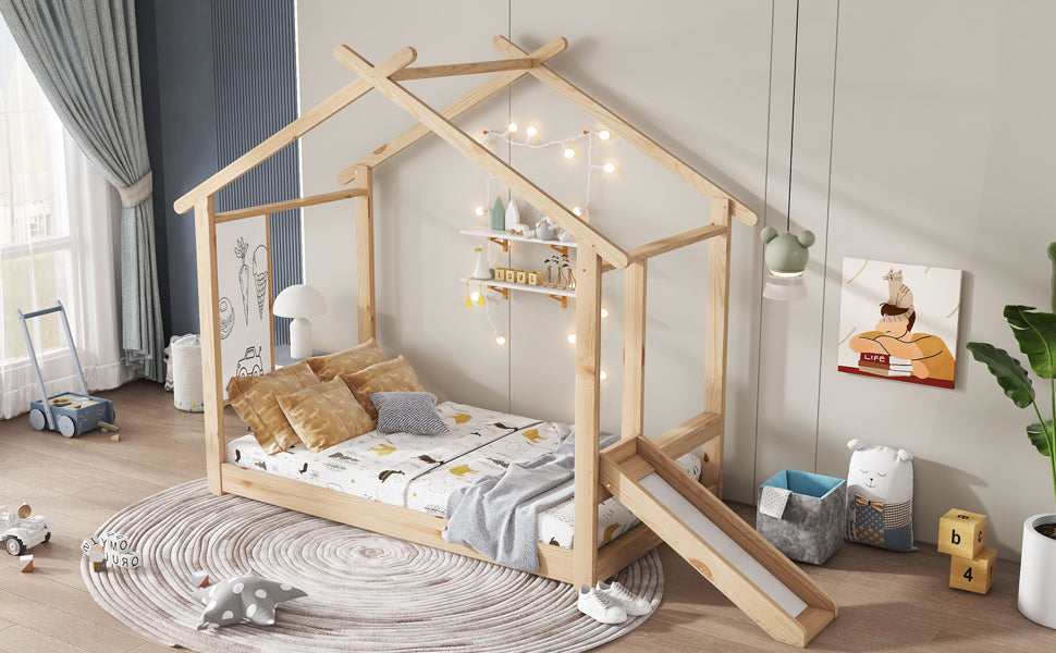Wooden Bed, Single with Slide, Roof Design & Whiteboard, Pine + MDF + Plywood