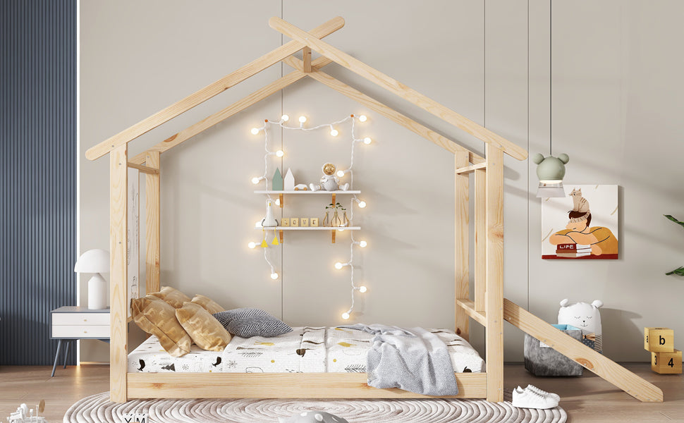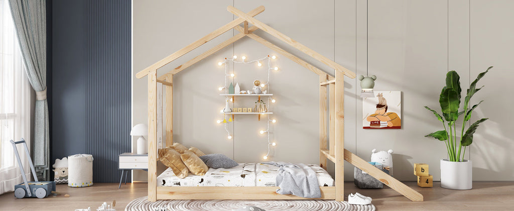 Wooden Bed, Children's Bed, Single Bed, With Fun Slide, Sturdy Bed Slats, Beautiful Roof Design