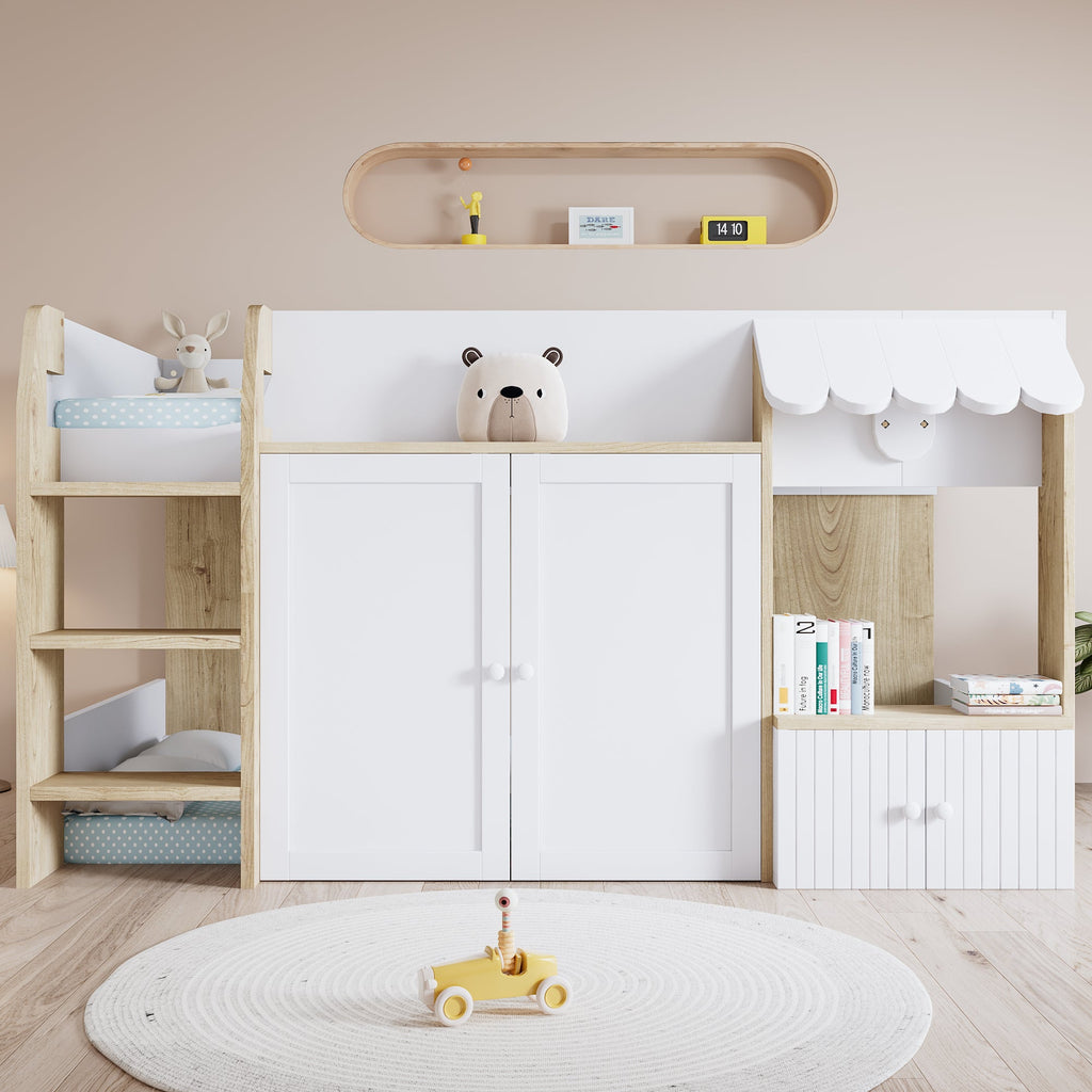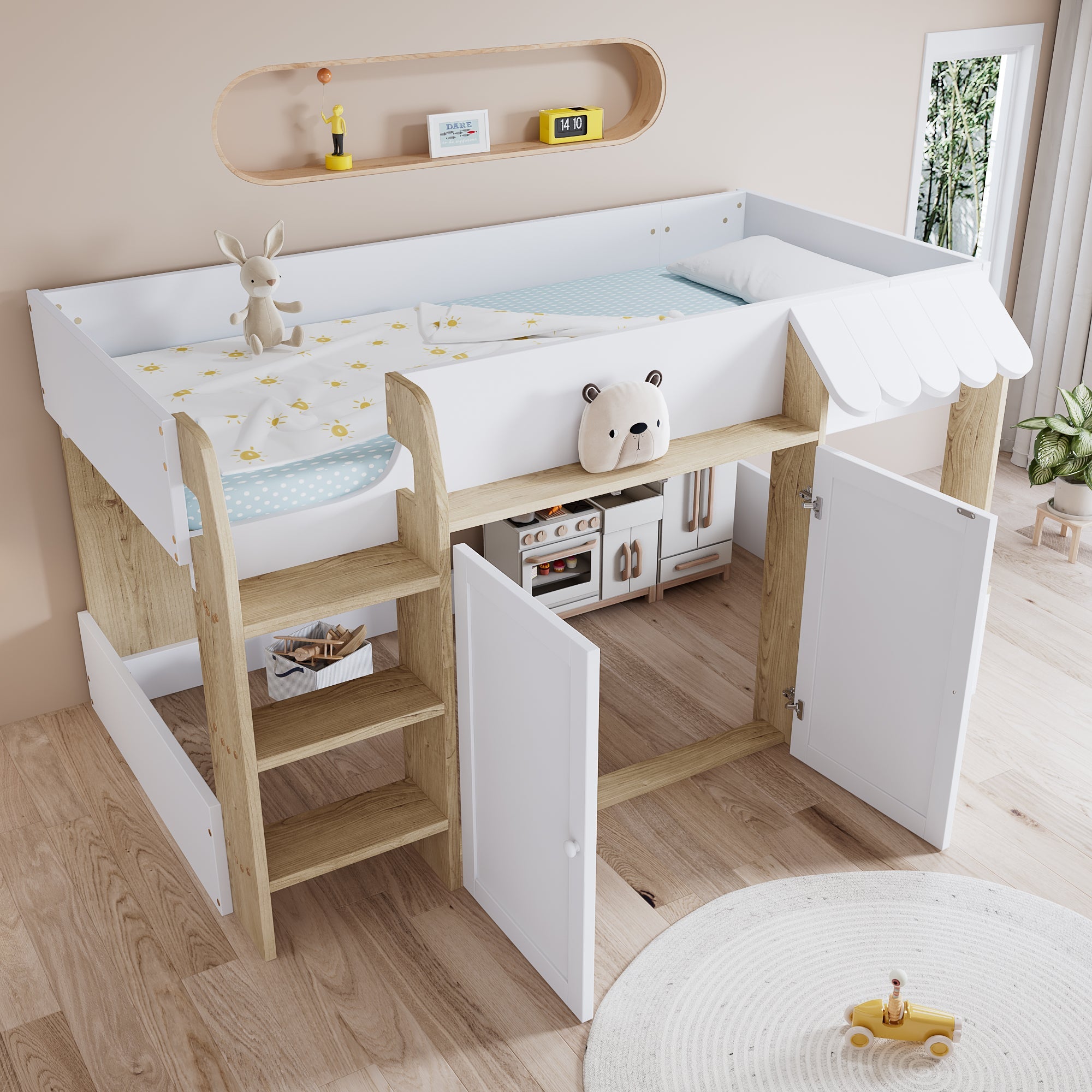 Meet our brand-new multifunctional bed—this piece is all about mixing practicality with fun for your space. Under the bed, there is a totally customizable area for you to play around with. Design it however you want, whether for storage or little extras, and turn that empty spot into something useful. We also tucked a small cabinet right into the bed frame, so you can stow away linens, books, or odds and ends to keep your room neat without extra clutter.