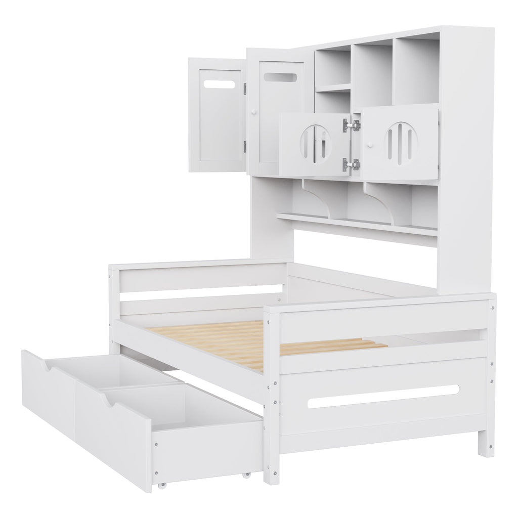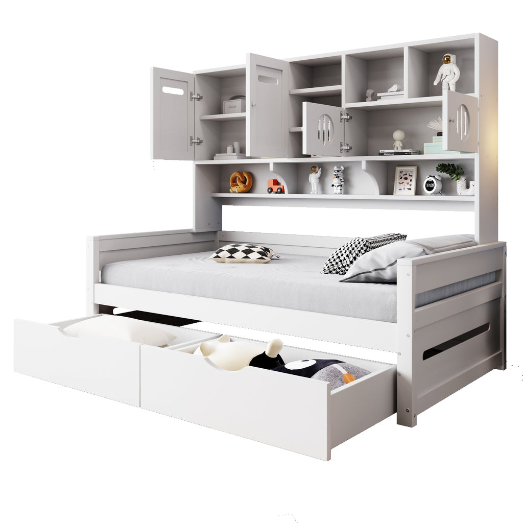 This sofa bed features a multi-functional storage space above the bed for customers to store their valuables. Multiple storage compartments offer space for decorative items or toy models to enhance the room. Two large drawers are located under the bed for customers to conveniently store clothes, bedding, and other everyday items.