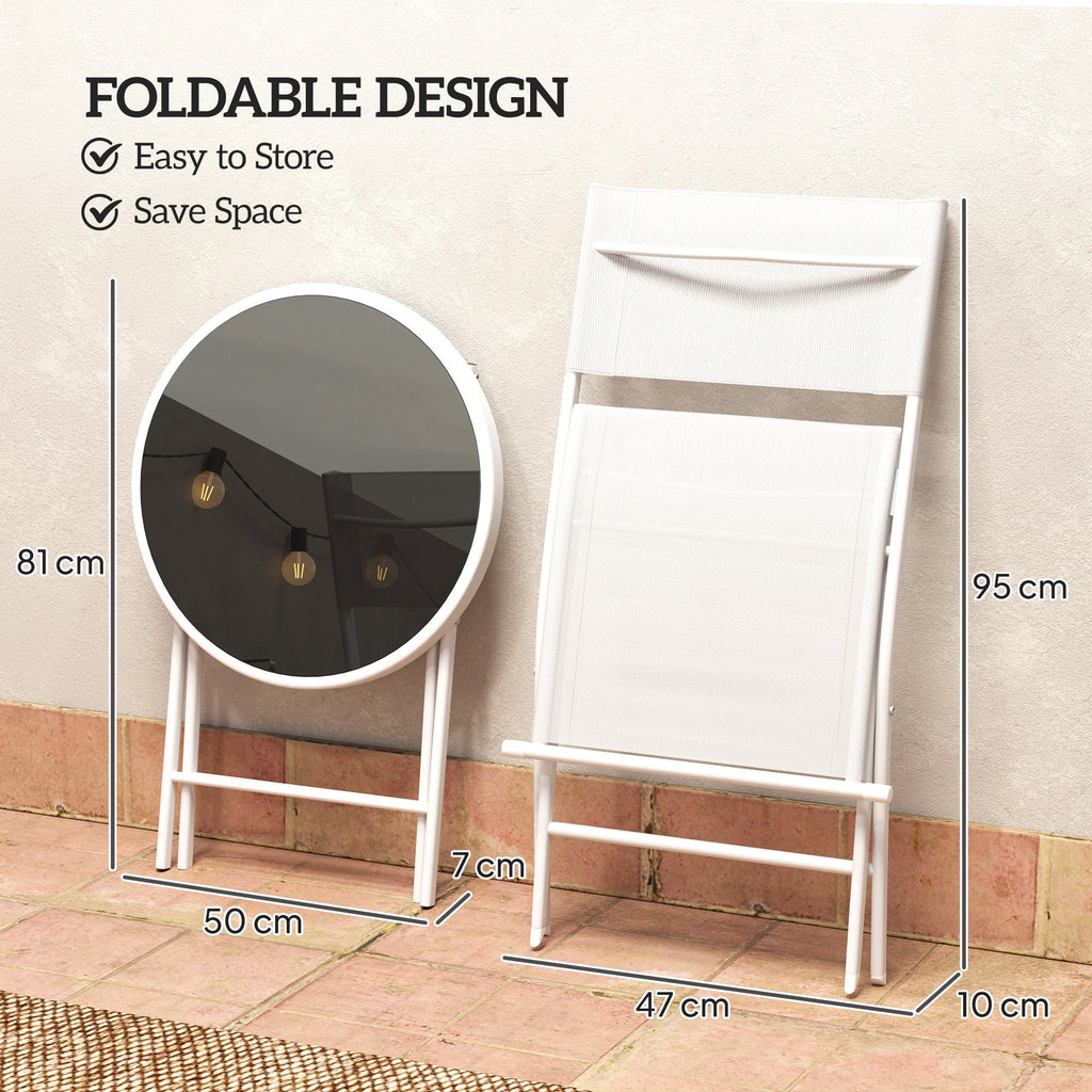 3 Piece Outdoor Bistro Set, Glass Top Table and 2 Folding Chairs, White