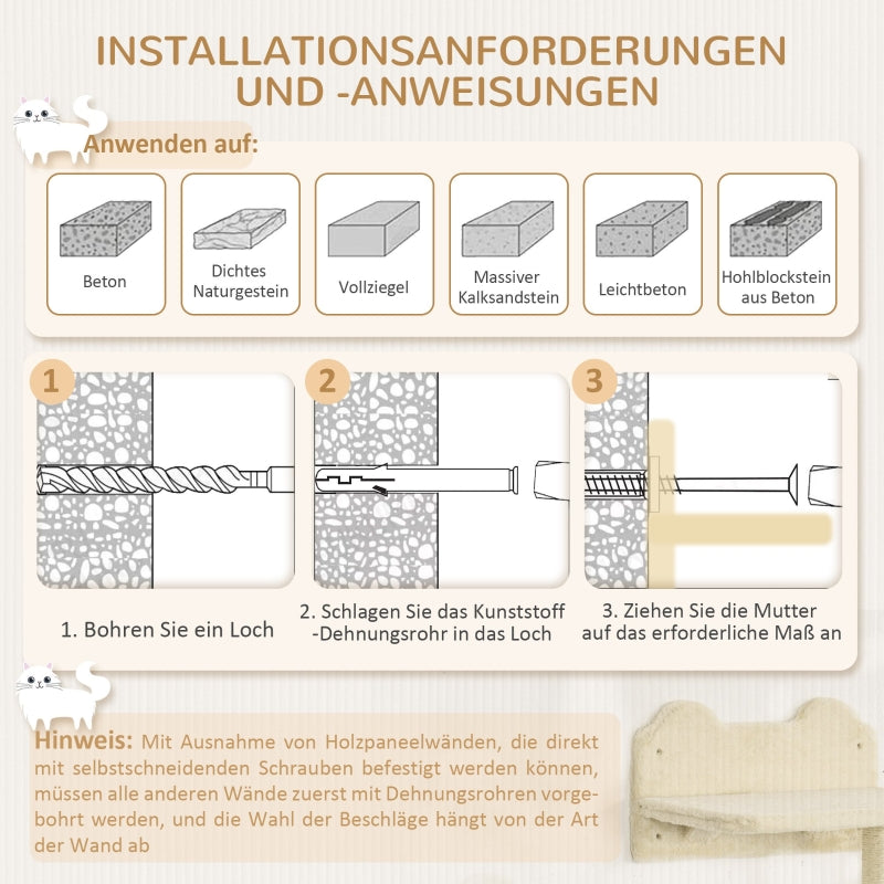 Soft and Cozy: The platforms of the wall-mounted cat tree are covered with soft plush, which is pleasant to the touch and provides your cats with a comfortable place to sleep and relax. Your cats will love this cozy retreat.