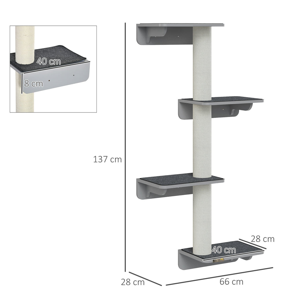 Product specifications: Overall dimensions: 66L x 28W x 137H cm. Jumping platform size: 40L x 28W cm. Mat size: 38.5L x 27W cm. Cat tree size (with sisal rope): 10 x 40H cm. Suitable for cats under 5 kg.