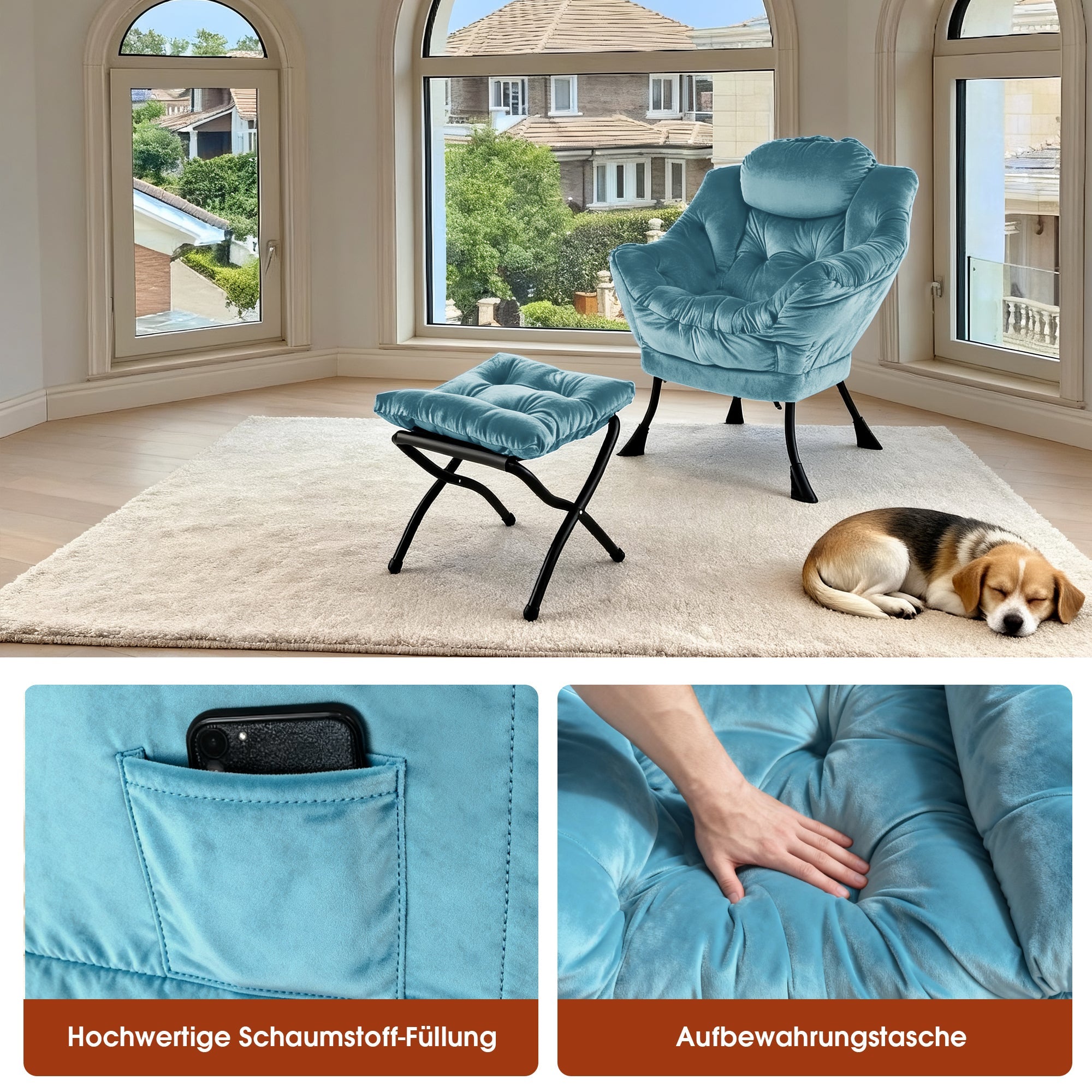 Supported by solid, rust-resistant metal tubing, the recliner and footstool set is stable. An additional center tube and non-slip feet further enhance overall stability. The armchair has a weight capacity of 150 kg, while the footstool can support 30 kg.
