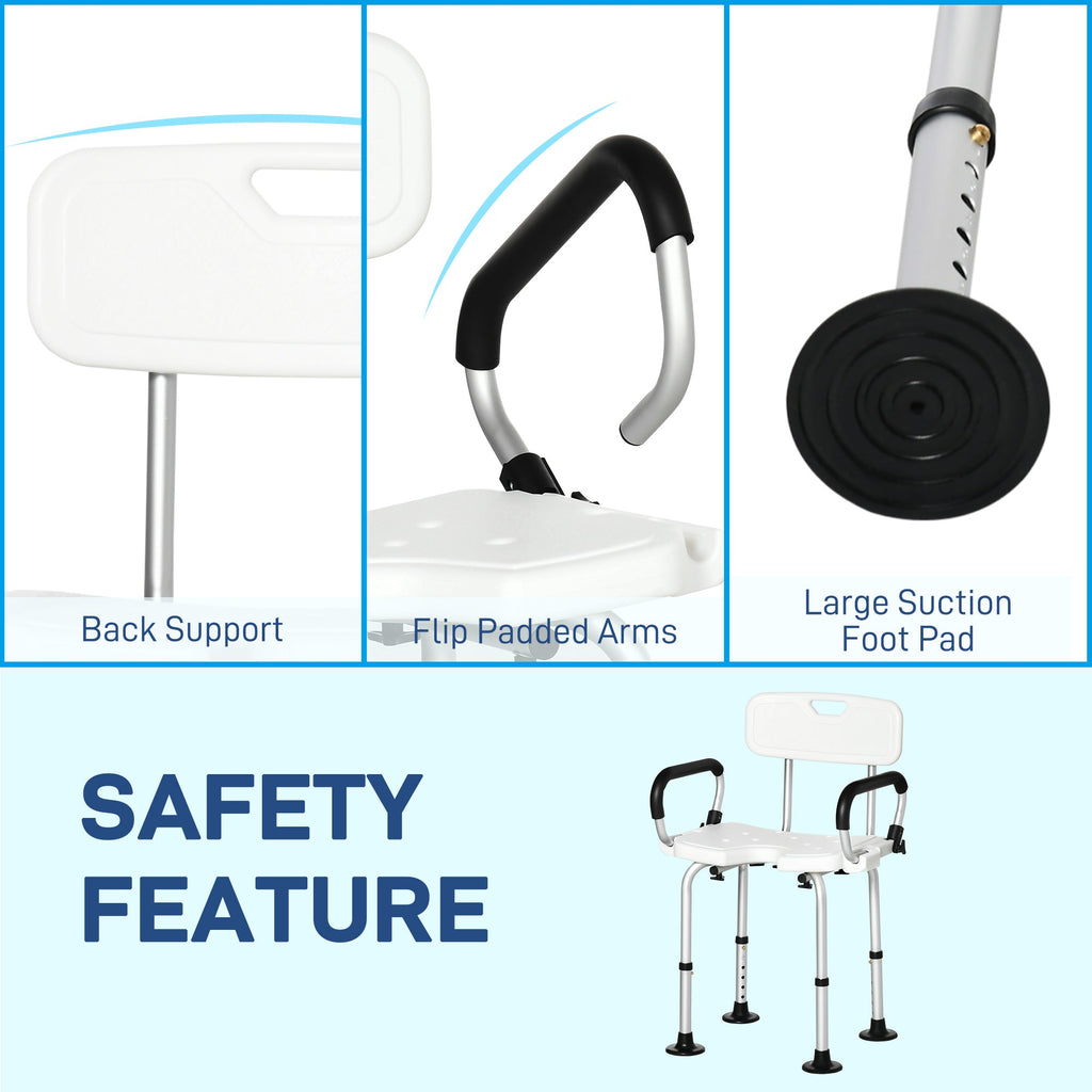 Shower Chair, Height Adjustable with Back and Flipped Padded Arms, White