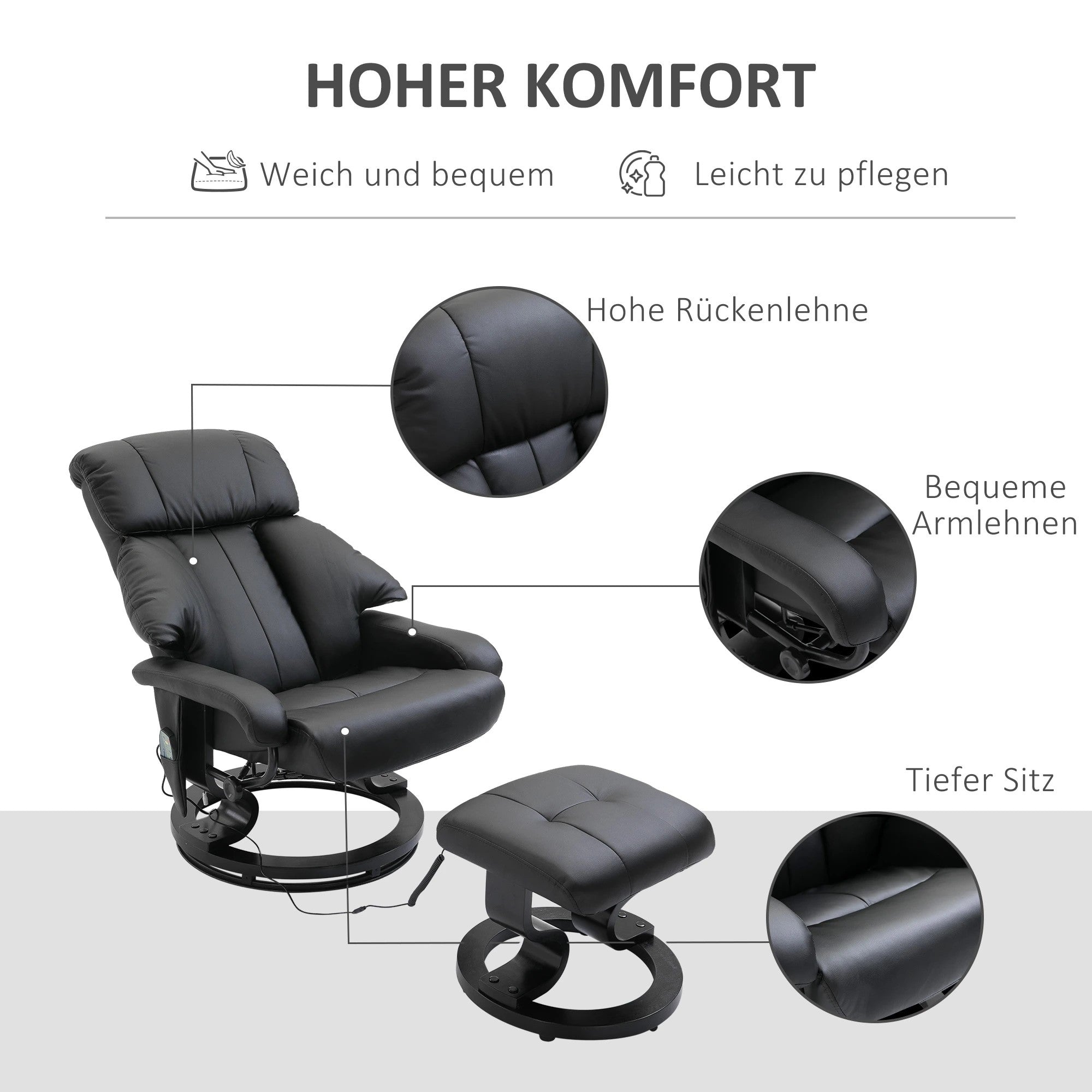 TV Armchair Reclining Deep Padding High Back 360° Swivel, Faux Leather Black