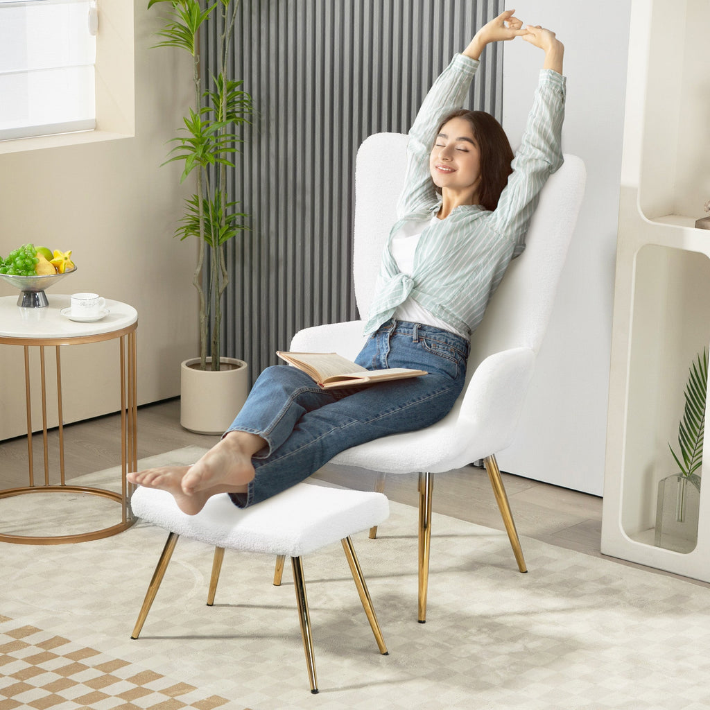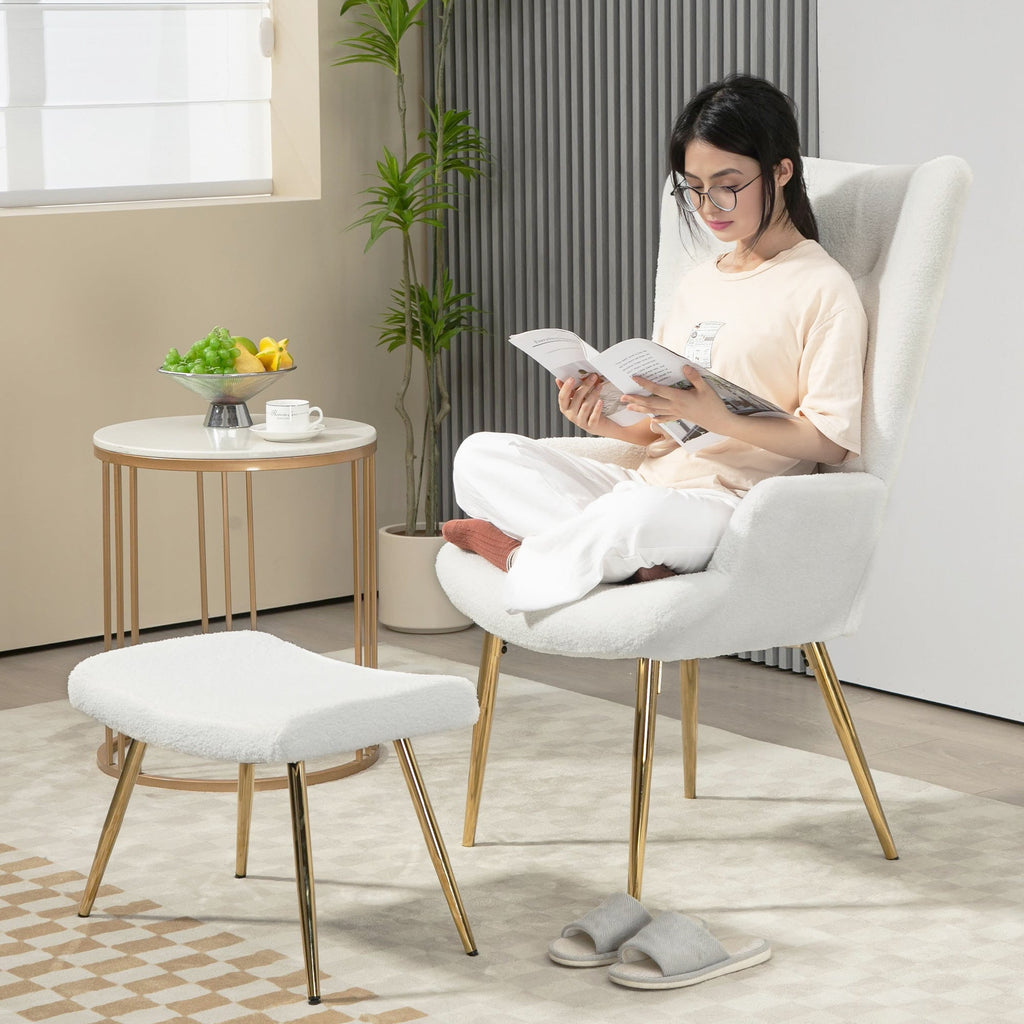 Modern Recliner Chair with Footstool Set: A wingback chair and footstool with white sherpa upholstery and striking gold-colored legs blend seamlessly into any decor.