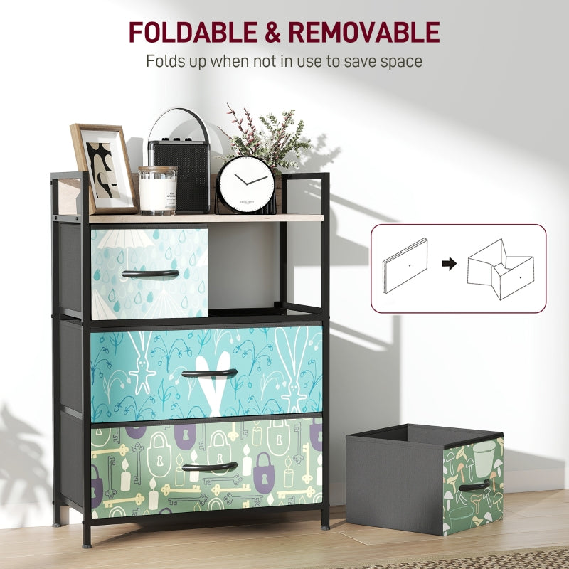 The storage unit offers four fabric drawers for plenty of storage. The drawers can be removed and folded when not in use.
