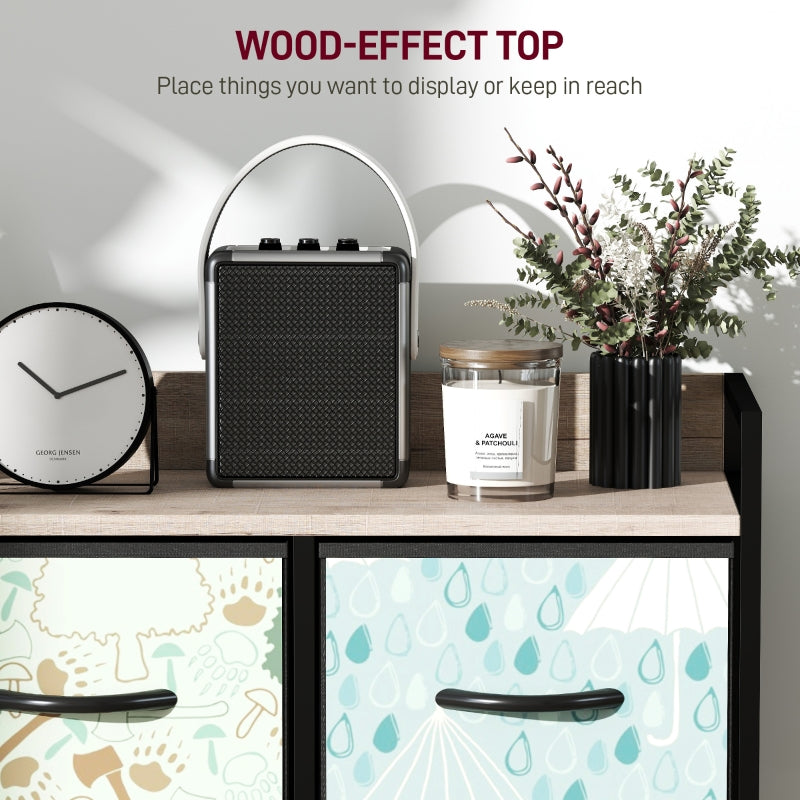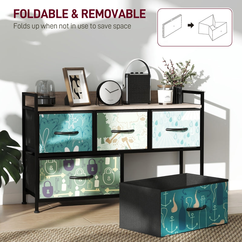 Five spacious fabric drawers offer plenty of storage for various items. The drawers can be removed and folded.