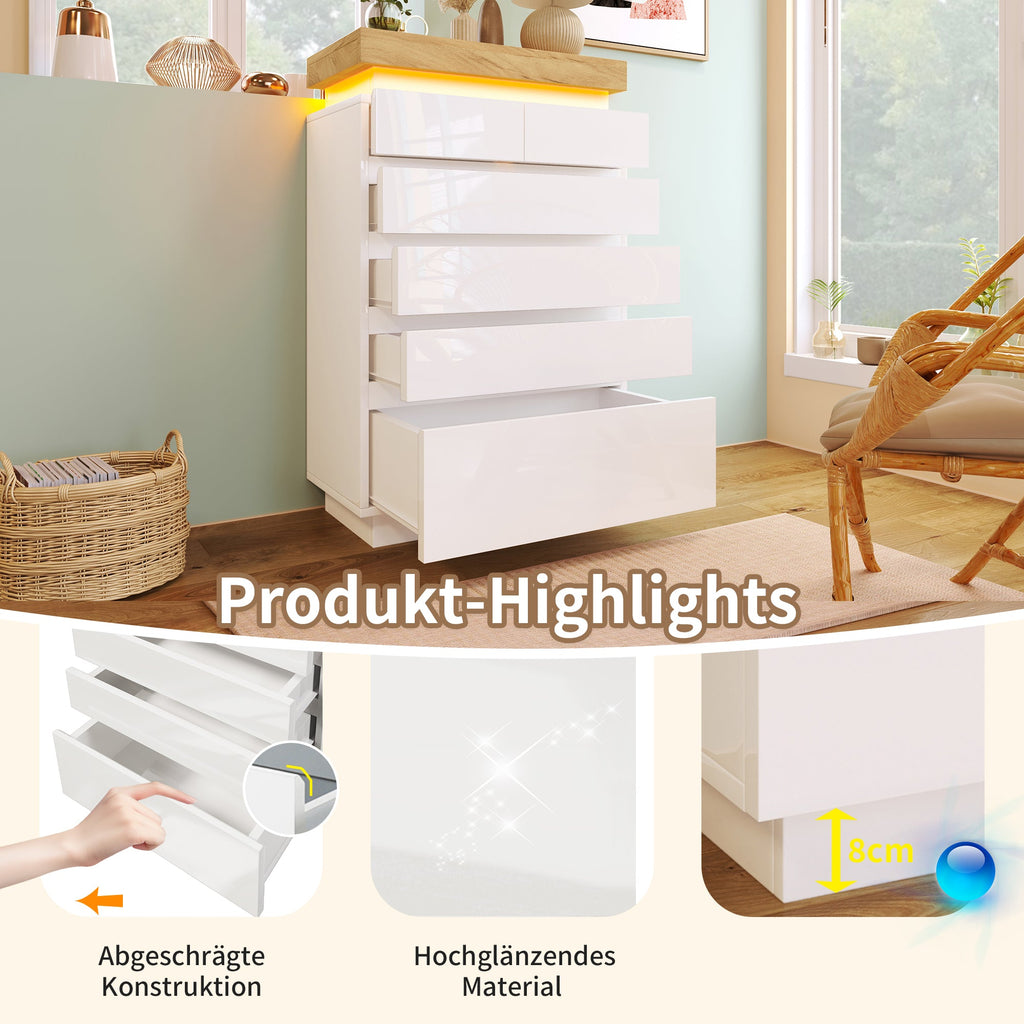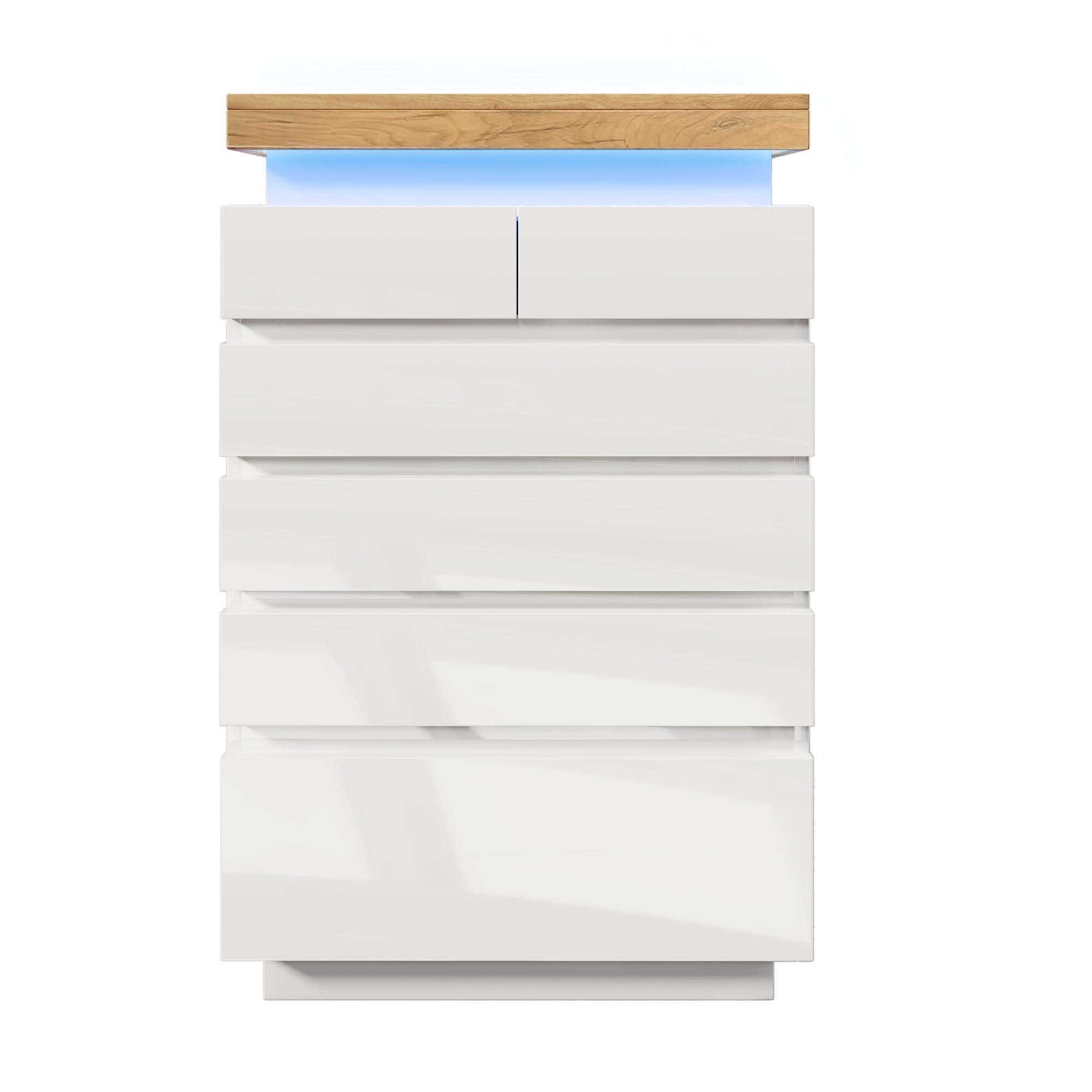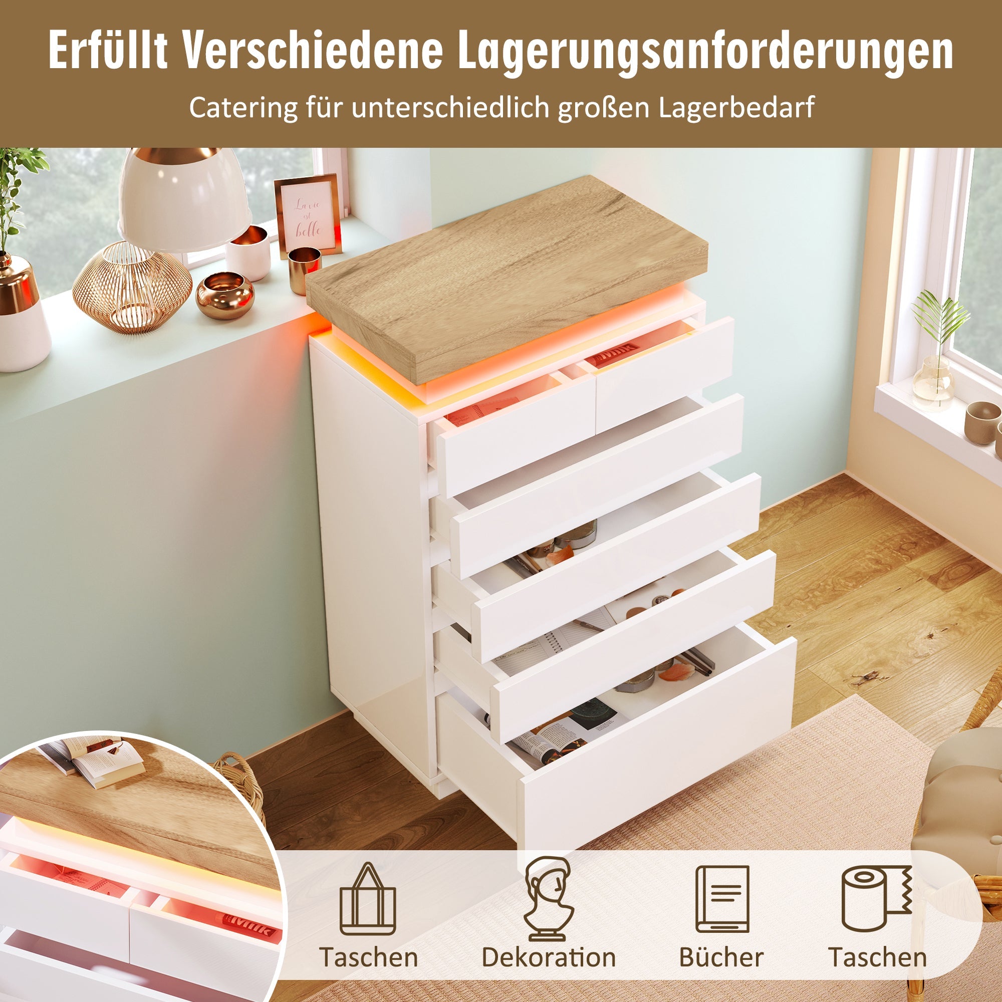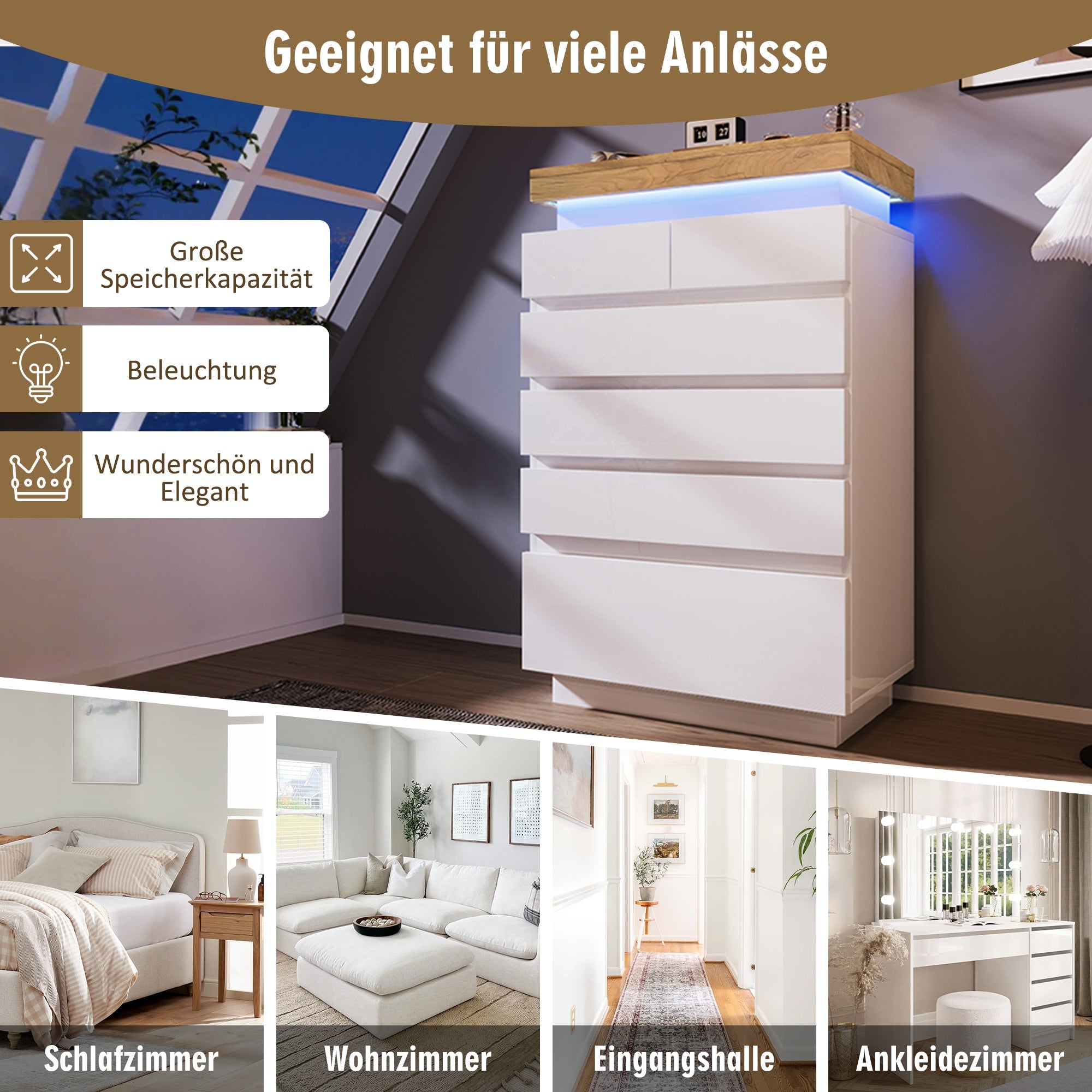 Chest of Drawers, 6-Drawer LED High-Gloss Sideboard, White
