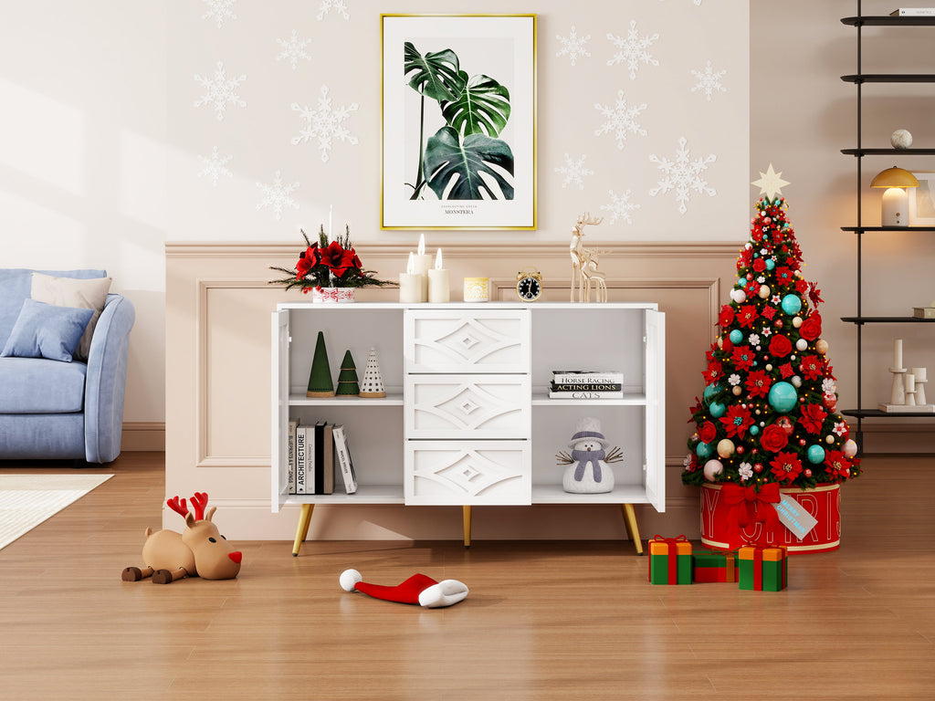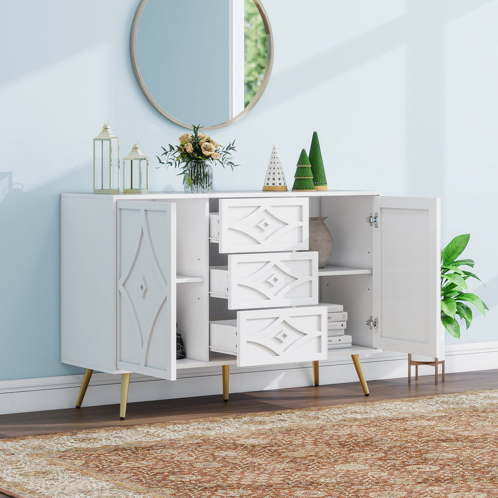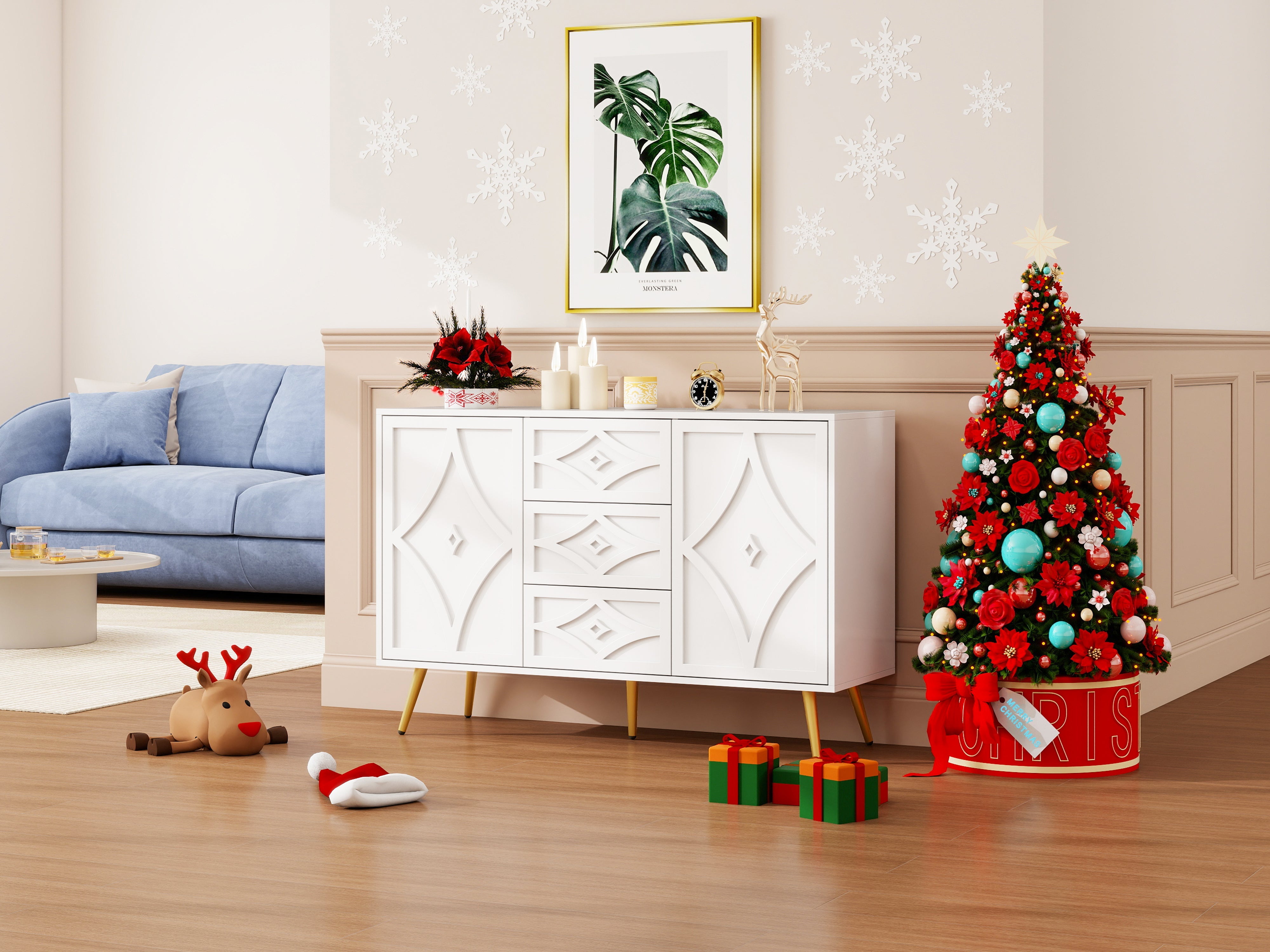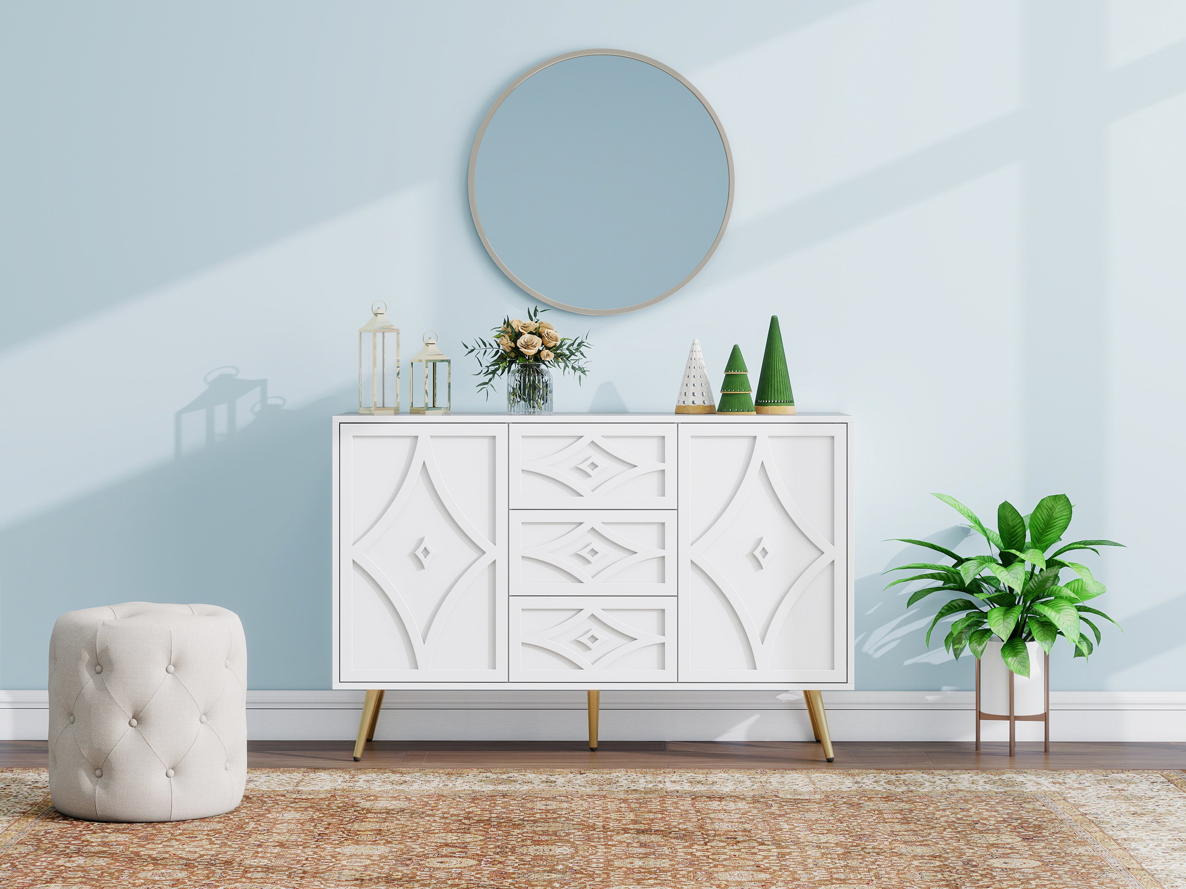 Chest of Drawers, Diamond Pattern with 3 Drawers & 2 Doors, Gold Feet White