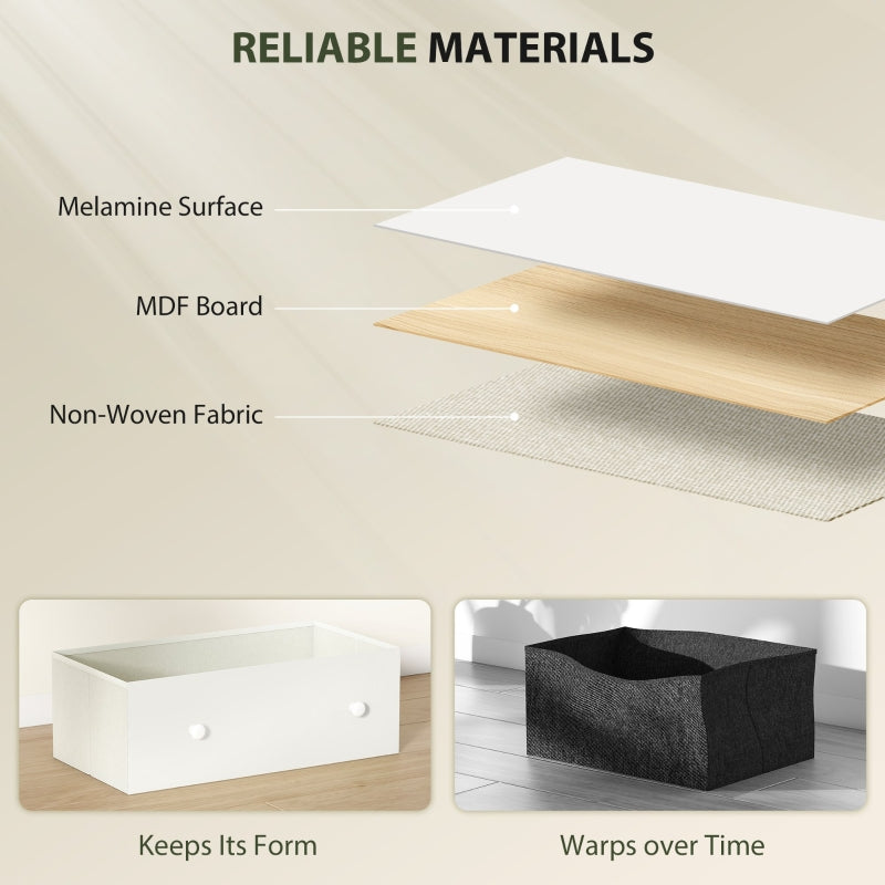 The drawers are foldable and come with handles. Each drawer is fully removable and folds flat in seconds, which is great for compact storage. Dual handles ensure pulling out the fabric drawers is smooth and effortless every time.