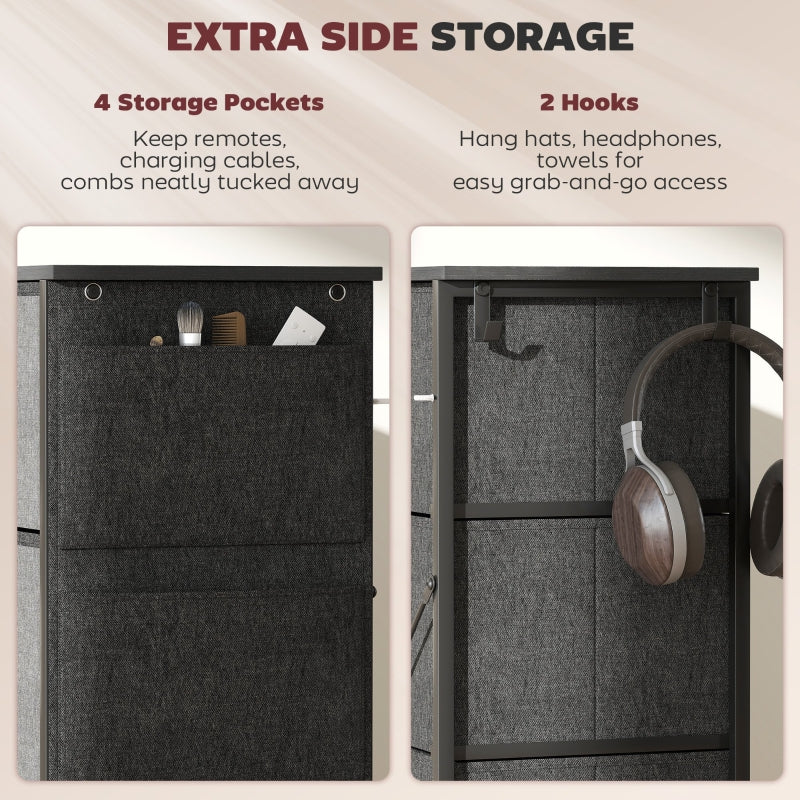 For extra storage, this fabric dresser includes four pockets and two hooks, great for holding small accessories like hats, jewelry, keys, and headphones.