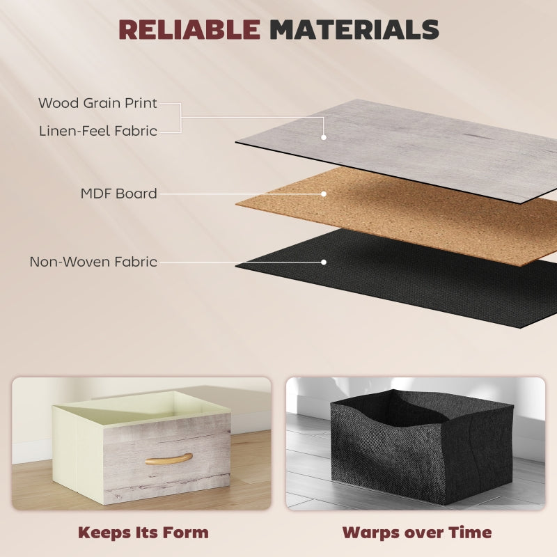 This bedroom chest of drawers features five fabric drawers—three small and two large—providing ample space for storing and sorting clothes, underwear, bedsheets, and much more.
