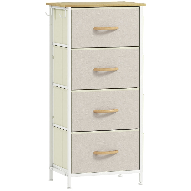 The fabric dresser offers extra storage with four pockets and two hooks, ideal for holding small accessories such as hats, jewelry, keys, and headphones.