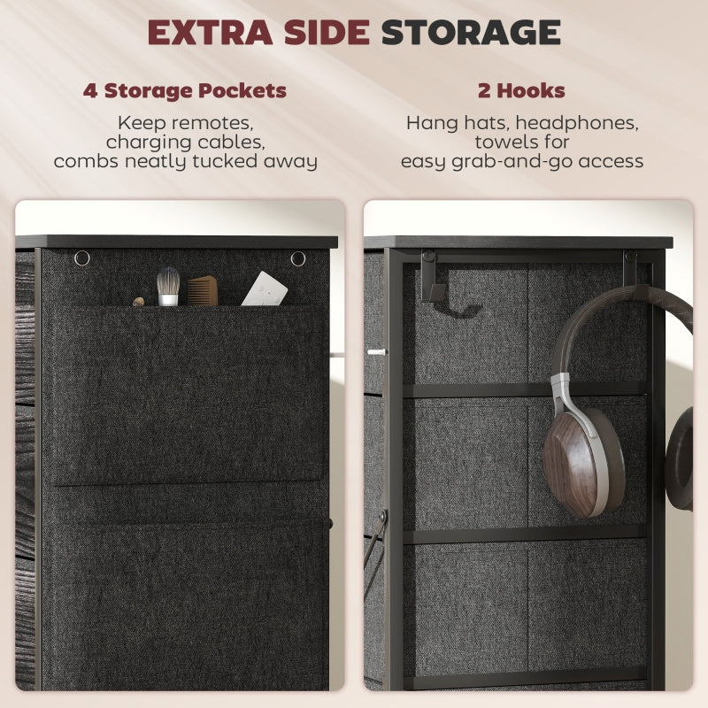 For extra storage, this fabric dresser features four pockets and two hooks, great for holding small accessories like hats, jewelry, keys, headphones, and similar items.