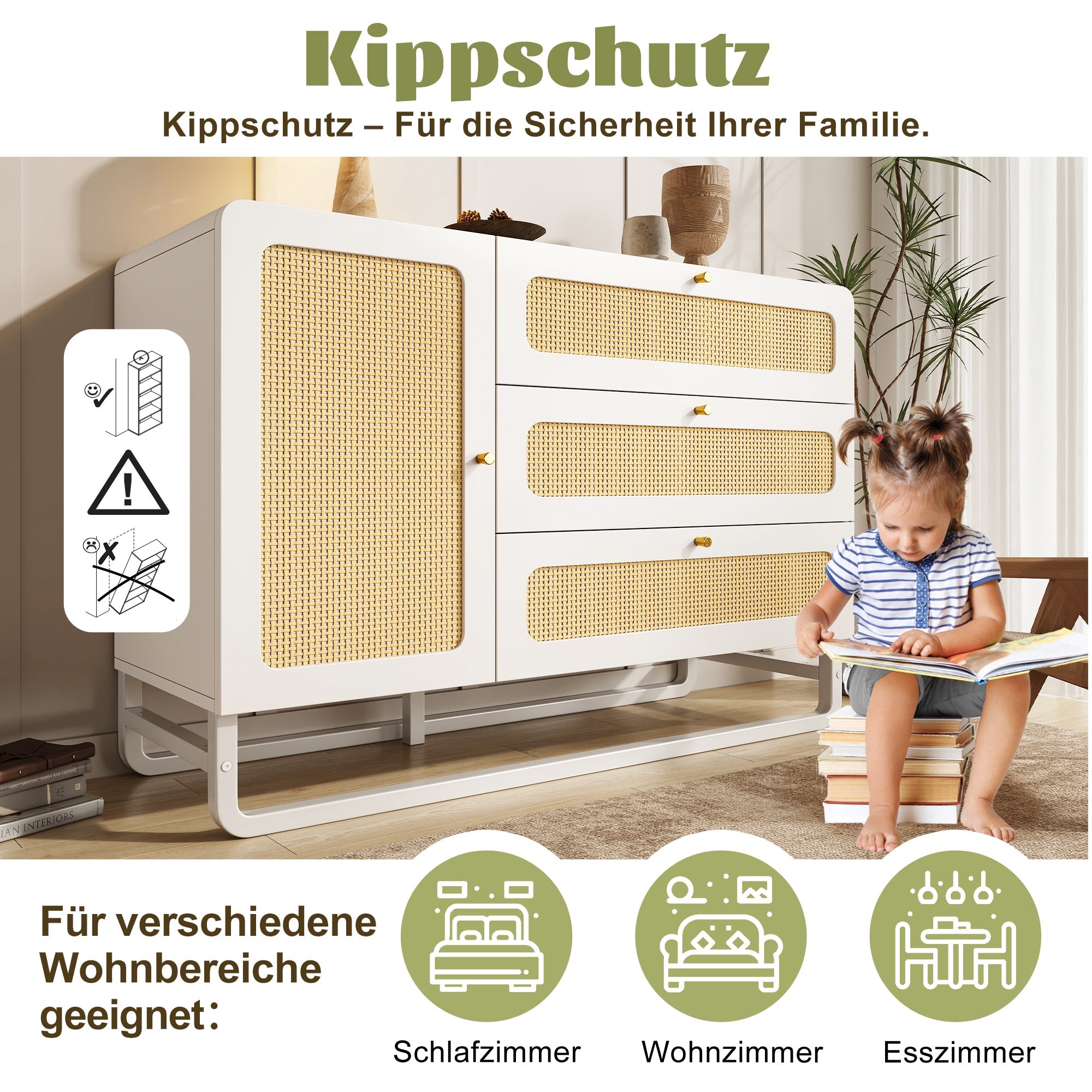 Chest of Drawers with Rattan & Gold Handles, 3 Drawers 1 Door, White Country Style