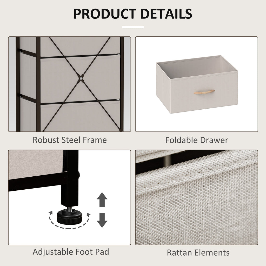 This tall chest of drawers features five foldable drawers, offering ample room for keeping your space tidy and organized.