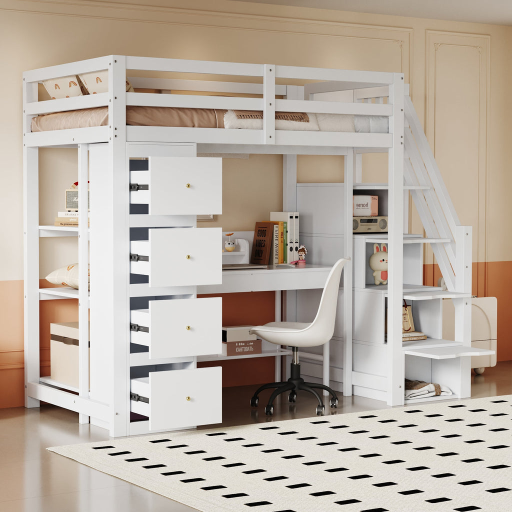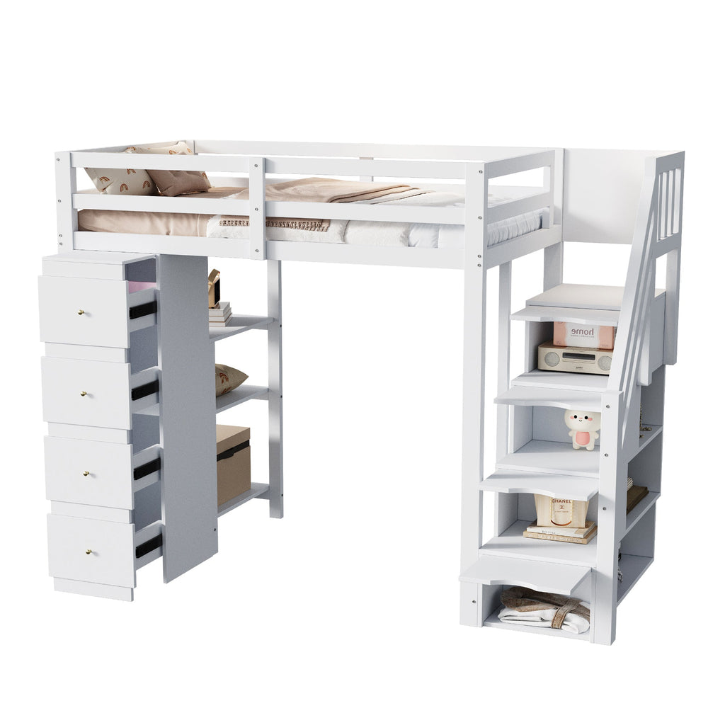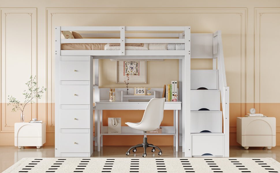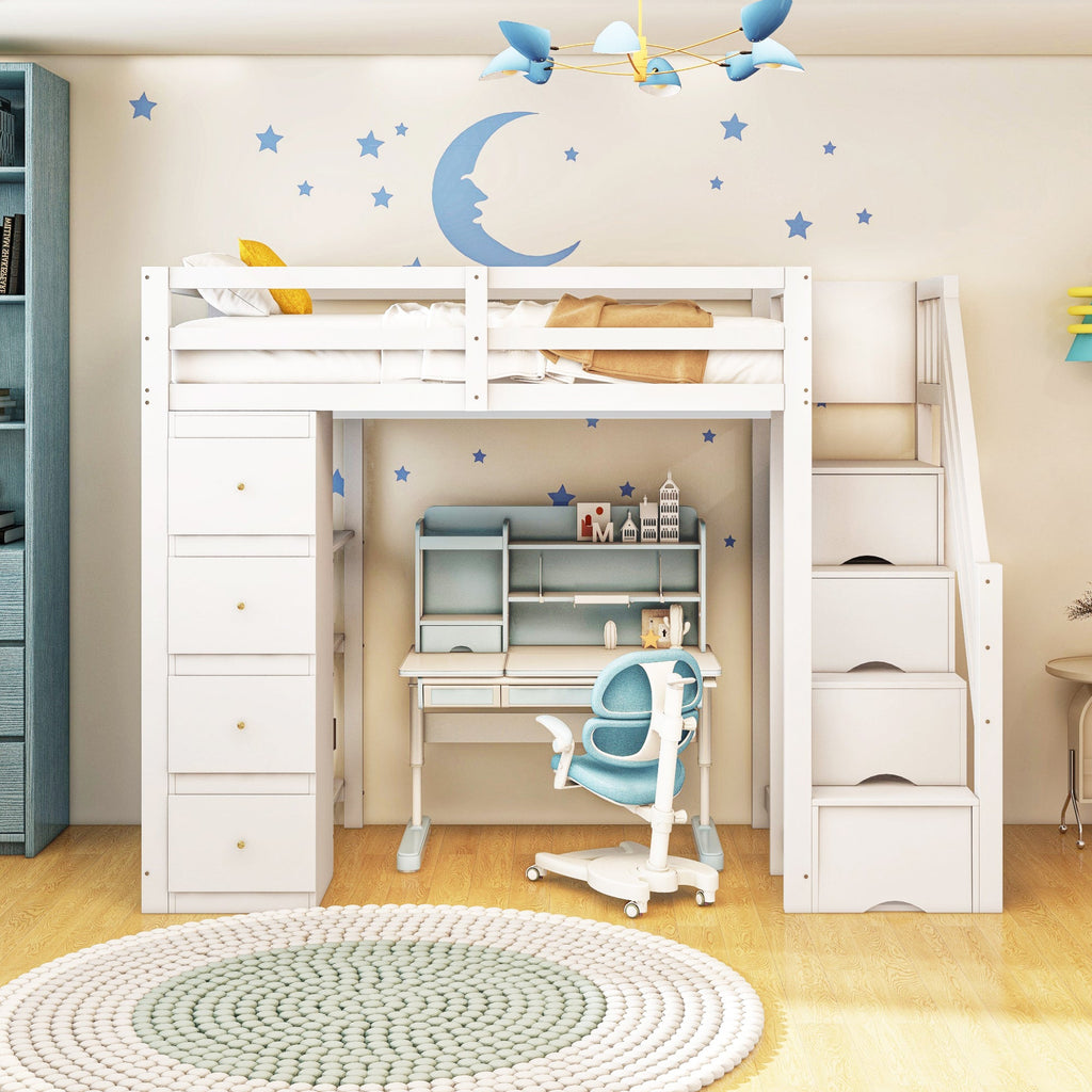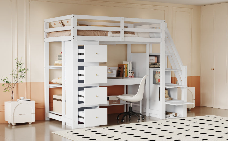 The bed offers ample storage space with four oversized drawers and three shelves, perfect for organizing clothes, toys, books, and other essentials. The side safety access with drawers provides additional storage while allowing easy and safe access to the upper bunk. This loft bed is surrounded by a sturdy safety rail to ensure a safe and comfortable sleeping space. With plenty of free space underneath, you can use it as a work area, entertainment room, or for other purposes.