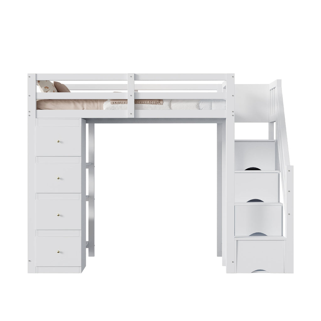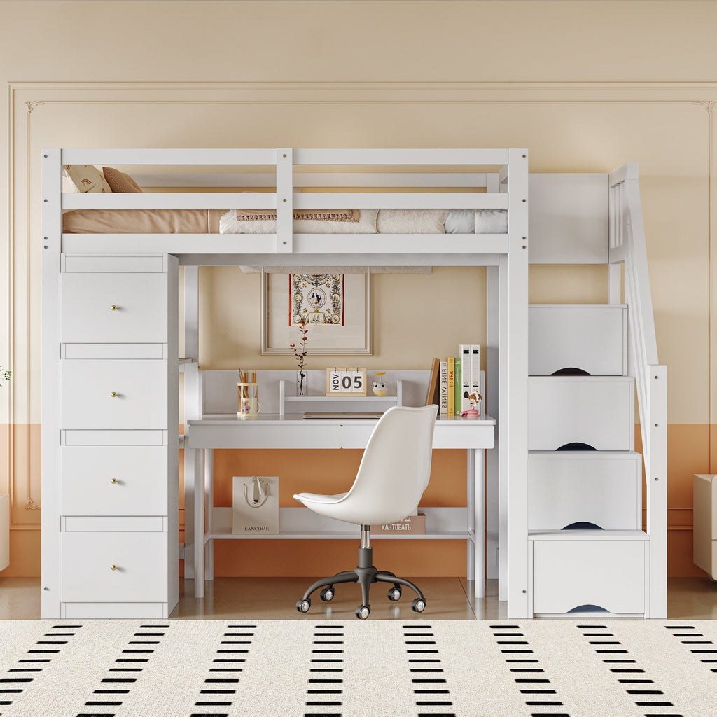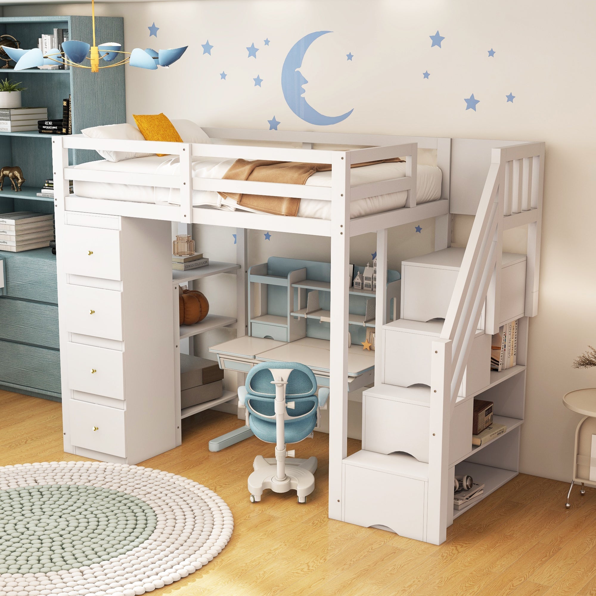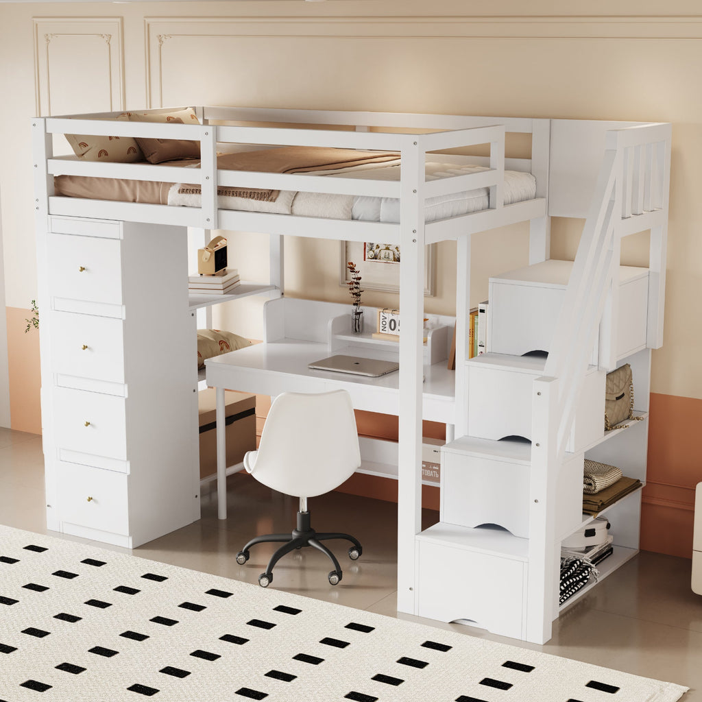 The bed offers ample storage space with four oversized drawers and three shelves, perfect for organizing clothes, toys, books, and other essentials. The side safety access with drawers provides additional storage while allowing easy and safe access to the upper bunk. This loft bed is surrounded by a sturdy safety rail to ensure a safe and comfortable sleeping space. With plenty of free space underneath, you can use it as a work area, entertainment room, or for other purposes.