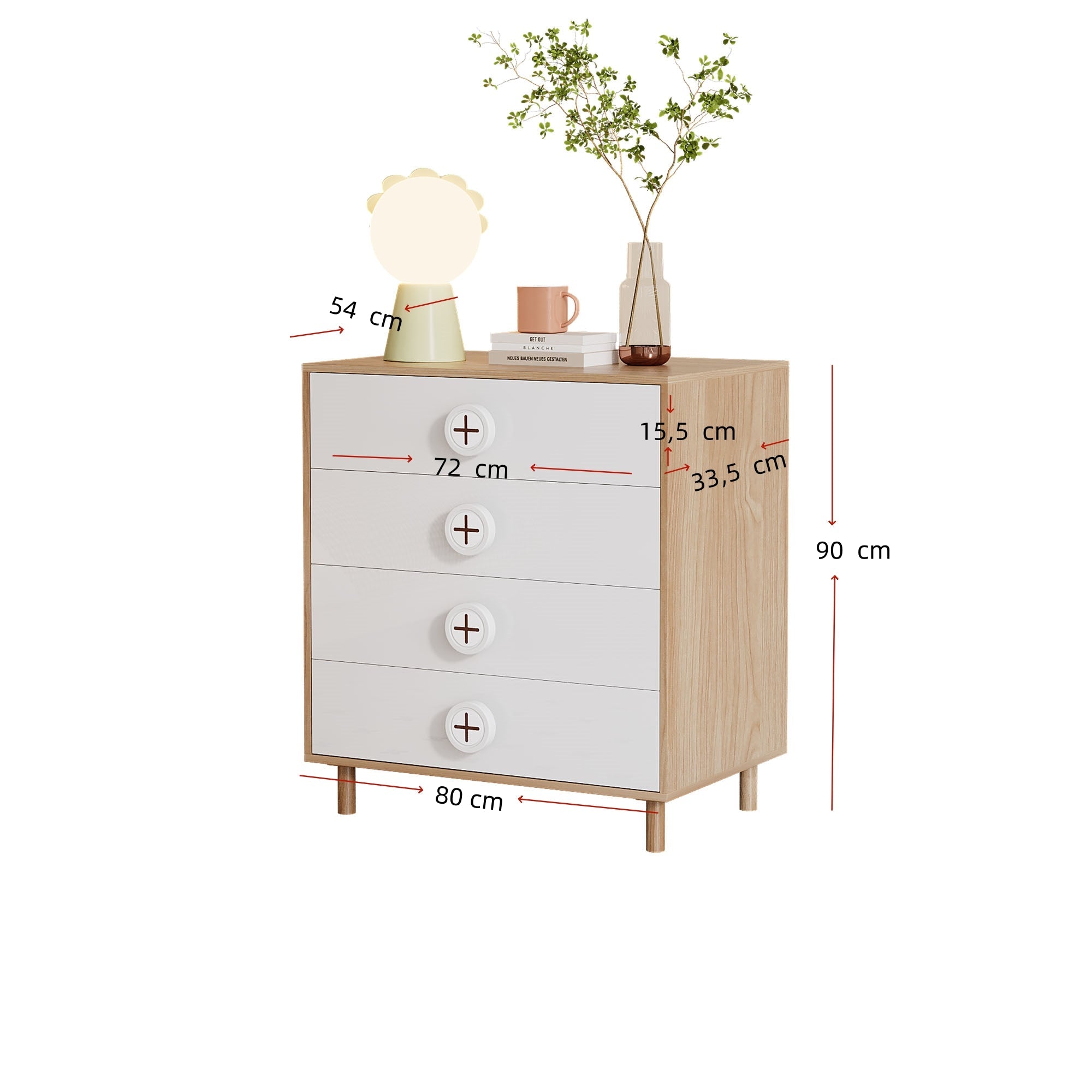This nightstand has dimensions of 80 x 54 x 90 cm (Length x Width x Height).