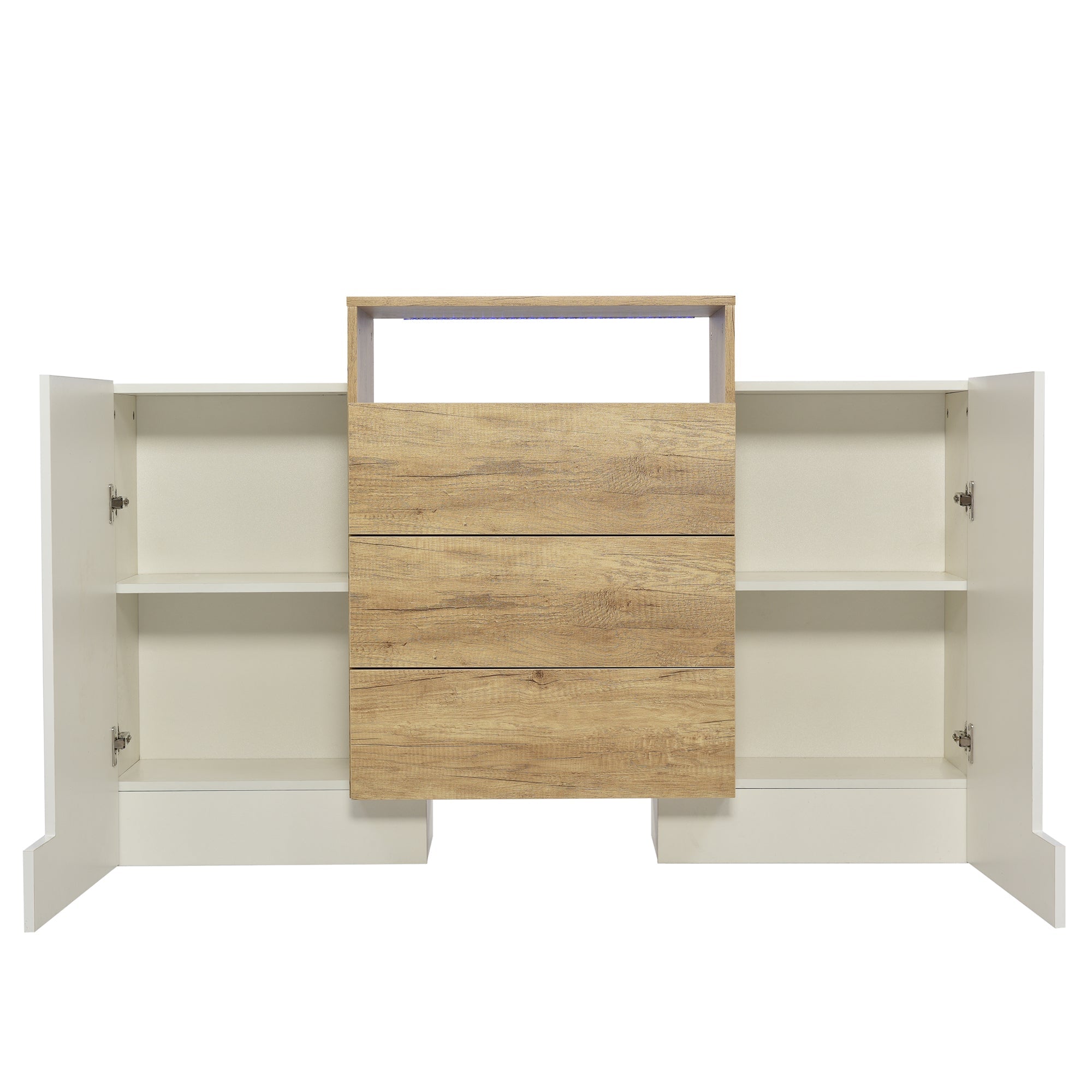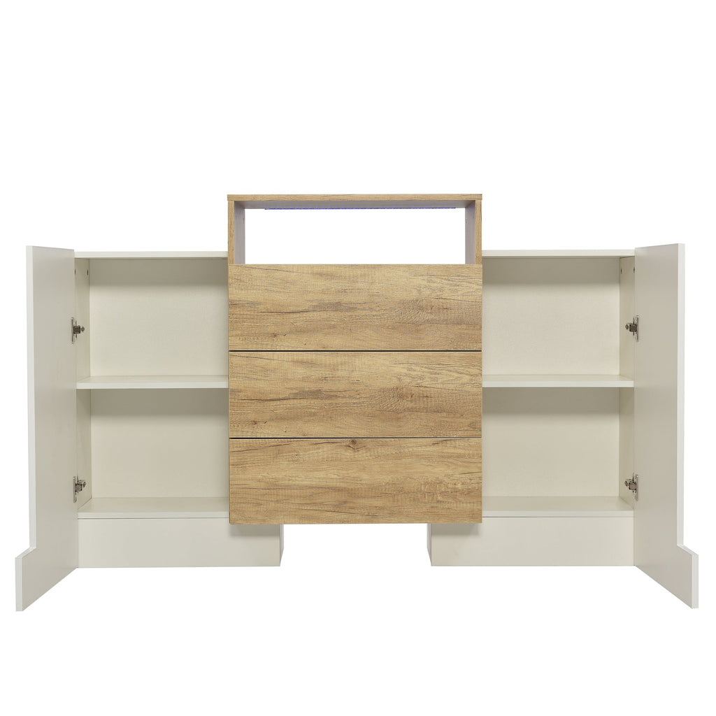Sideboard, 140cm Modern Chest of Drawers with LED, High-Gloss White & Wood