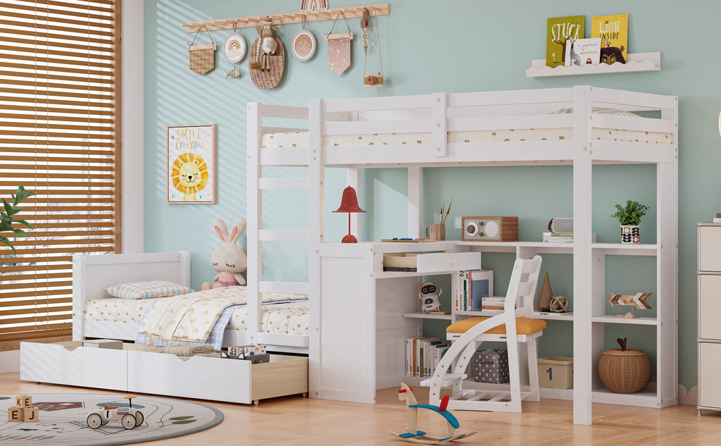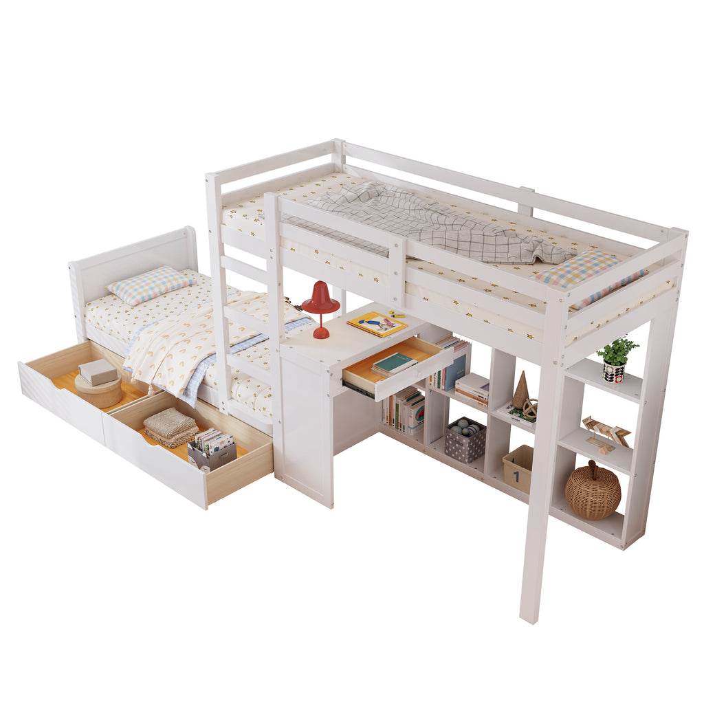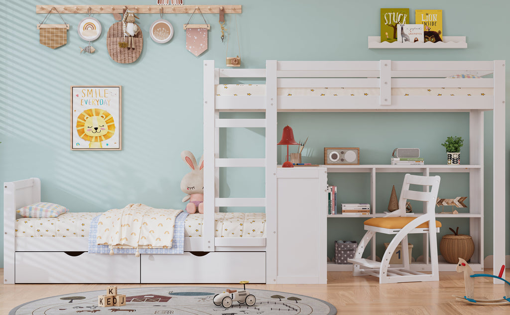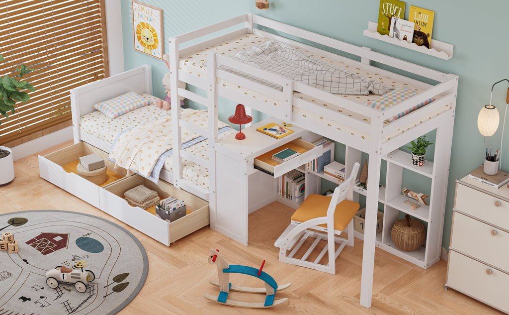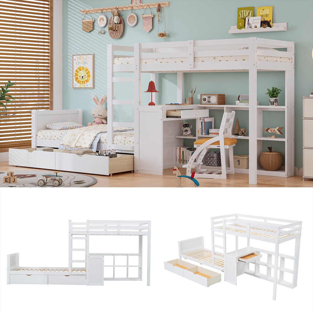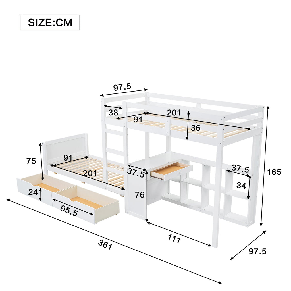 Bunk Bed, 3-Step Ladder, Desk & Drawers, Pine+MDF White
