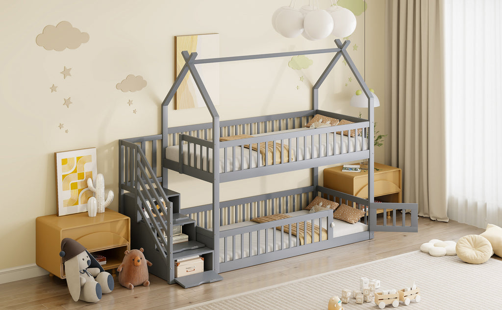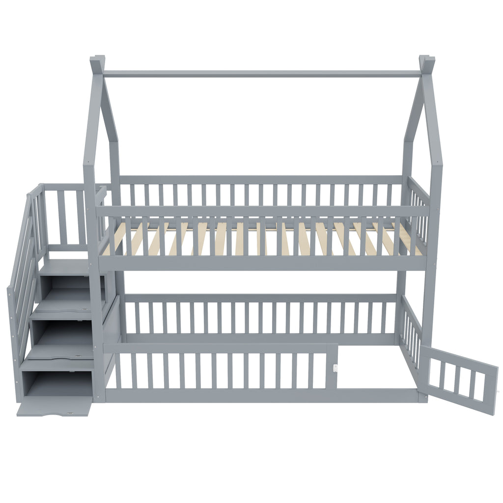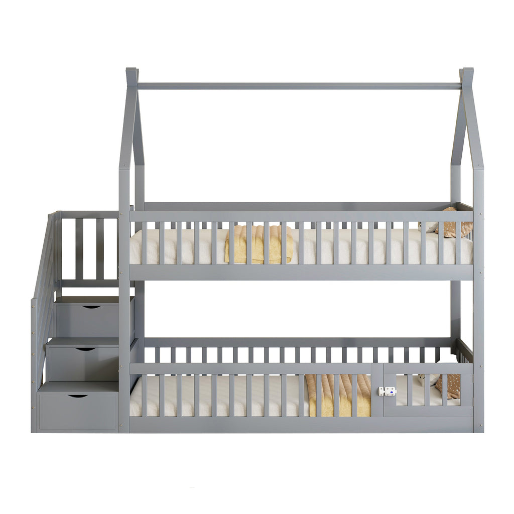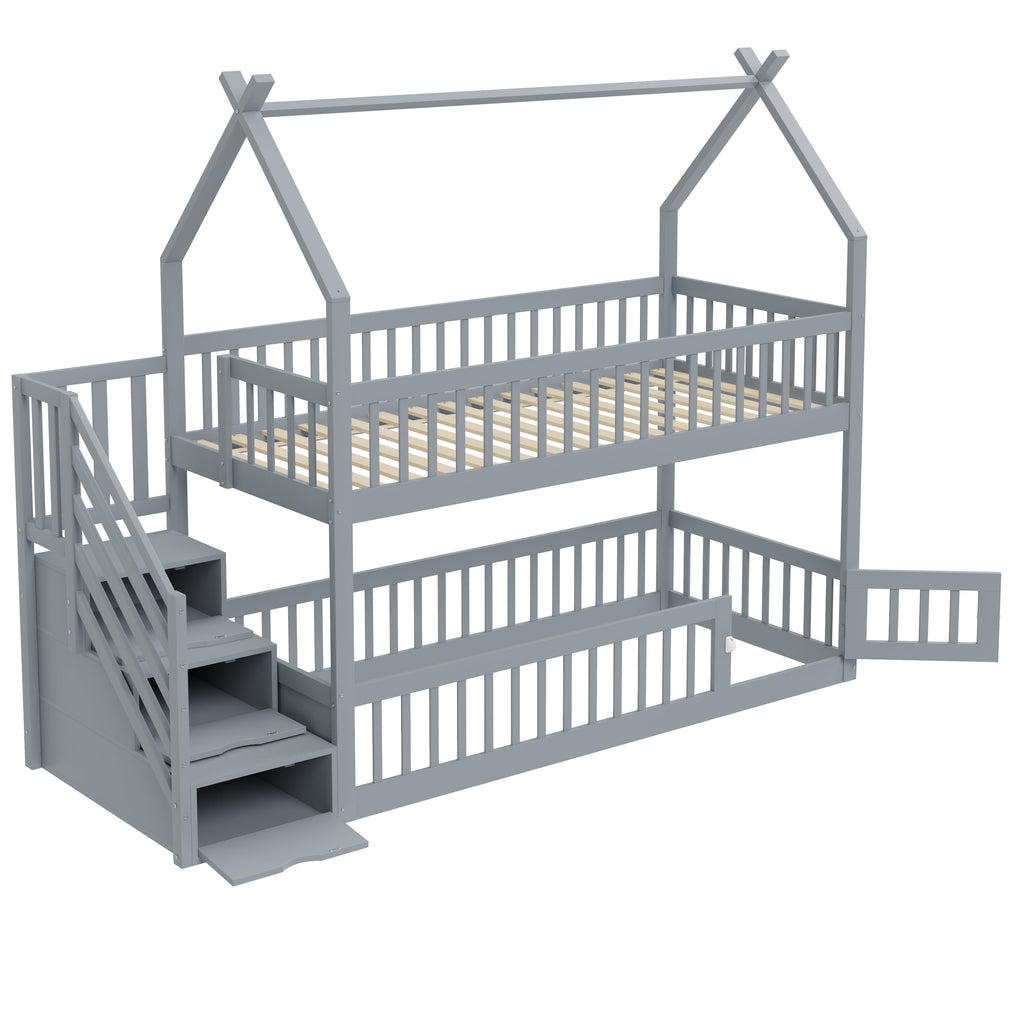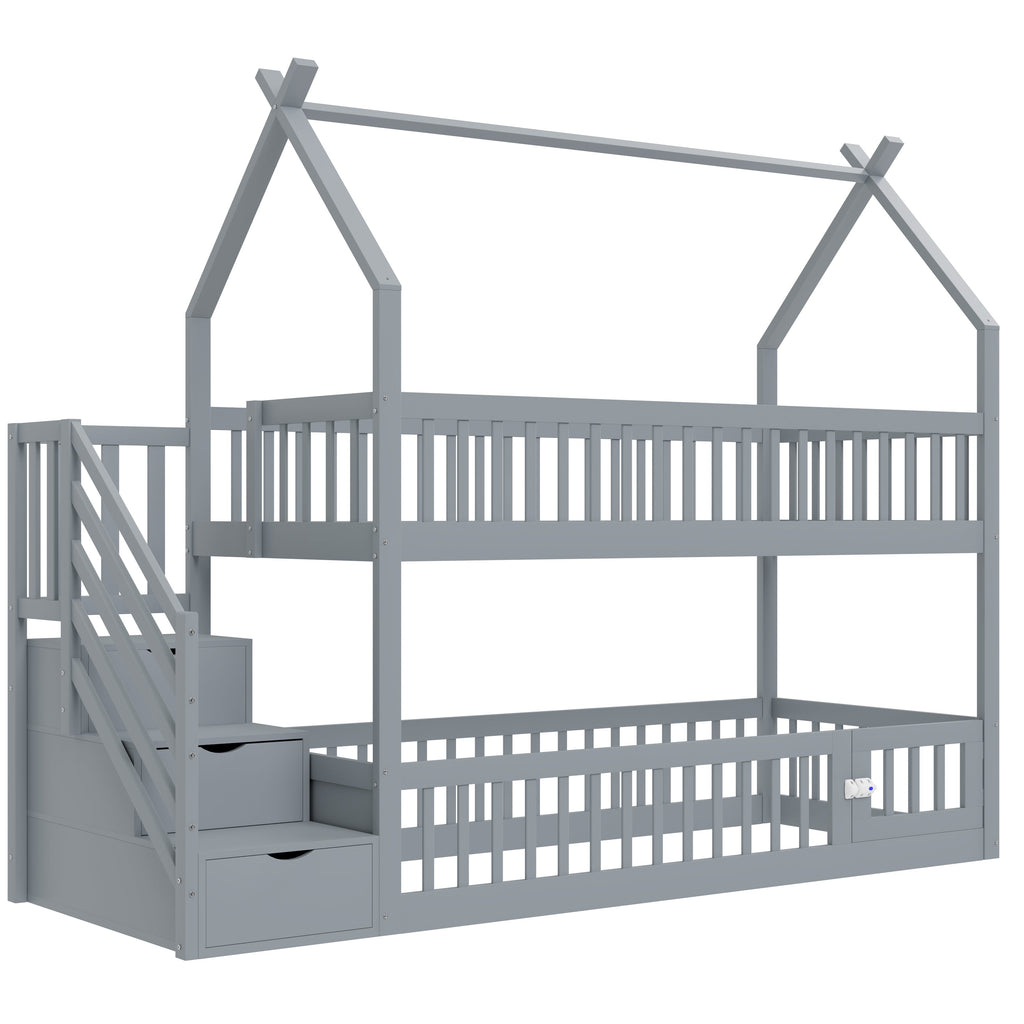 Bunk Bed, 90x200 Children's Single with Roof, Ladder & Storage Drawers, Solid Wood Gray