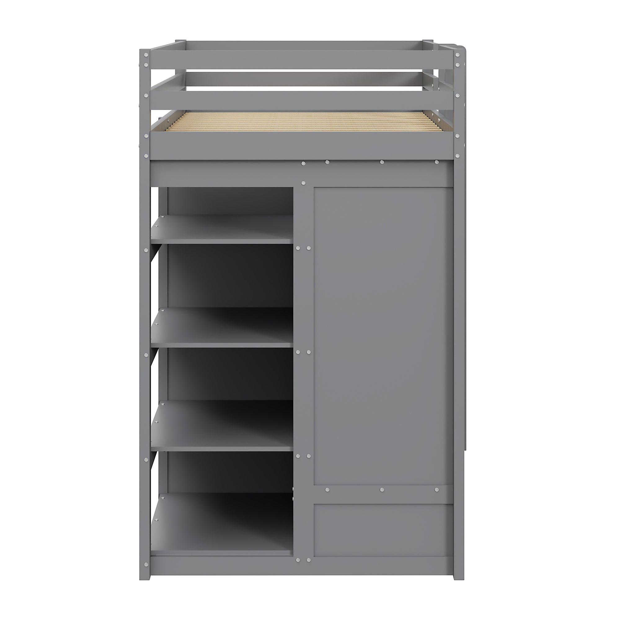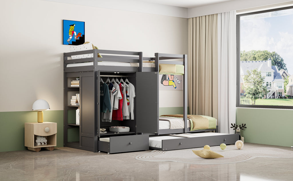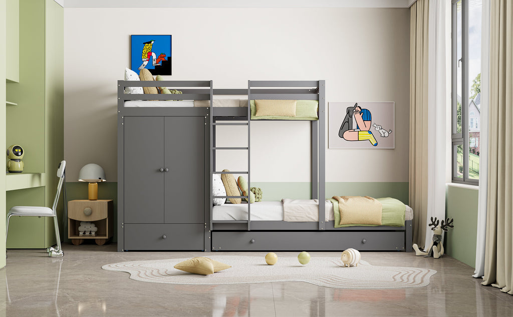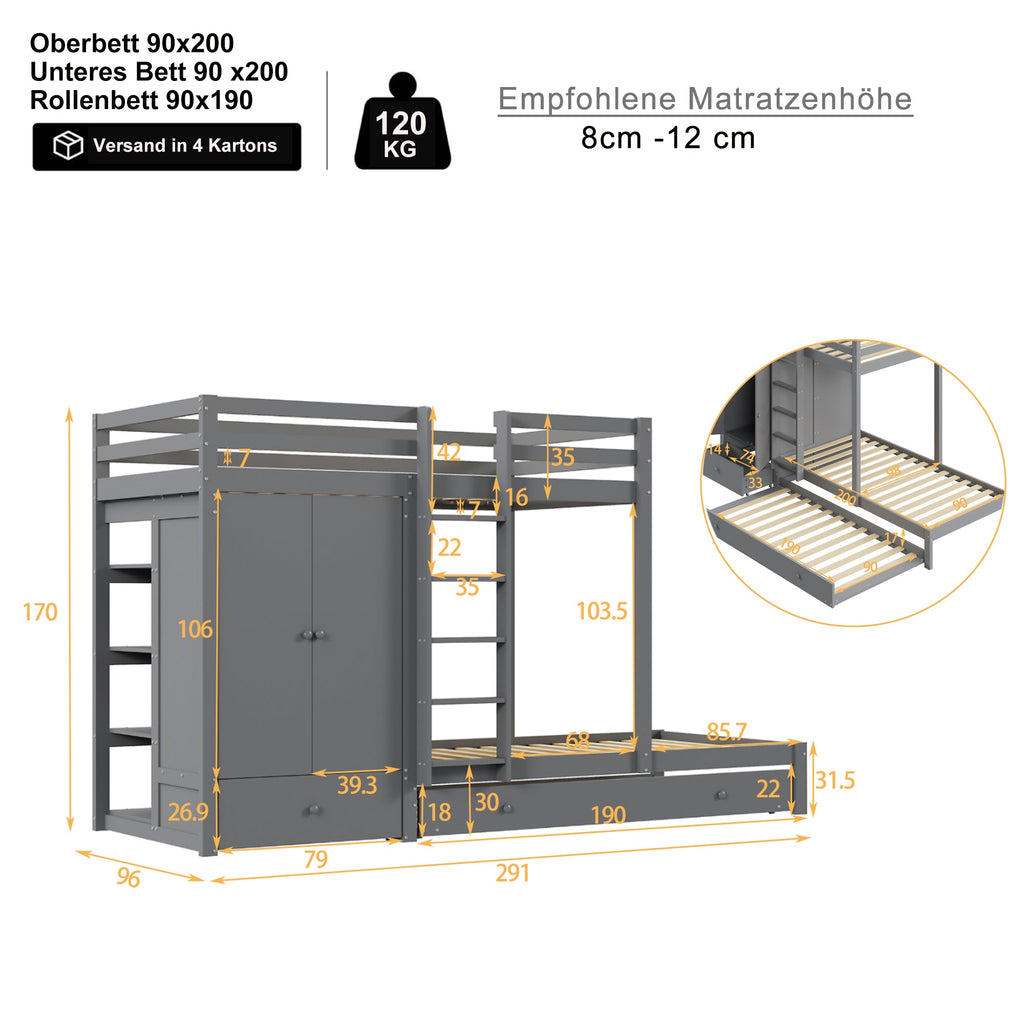 Bunk Bed, 90x200 Pull-Out, Multifunctional with Wardrobe, Drawers & Storage, Solid Wood Grey