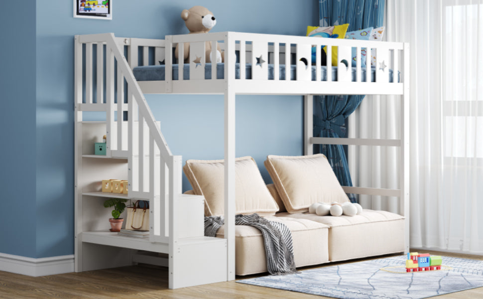 Product Description: Transform your child's room into a true adventure land with this stylish solid wood loft bed. The sophisticated design, featuring a safe staircase, integrated shelving, and a cozy sofa area, offers not only a comfortable place to sleep but also a haven for play and relaxation. The loving details, such as the star and moon motifs, create a dreamy atmosphere, while the sturdy construction ensures safety. This is the perfect choice for modern families who want to combine functionality and design.