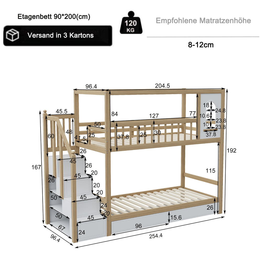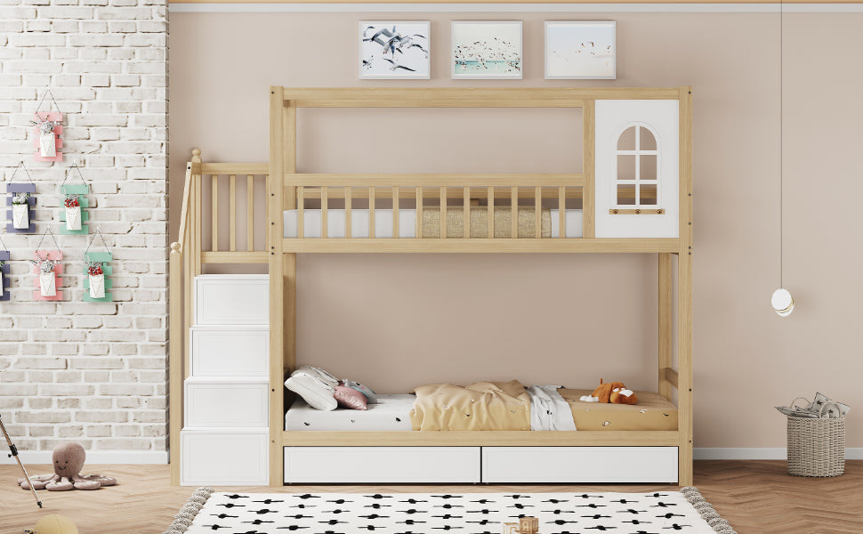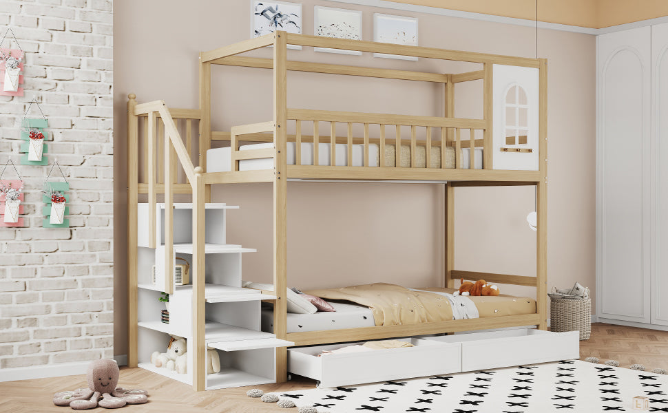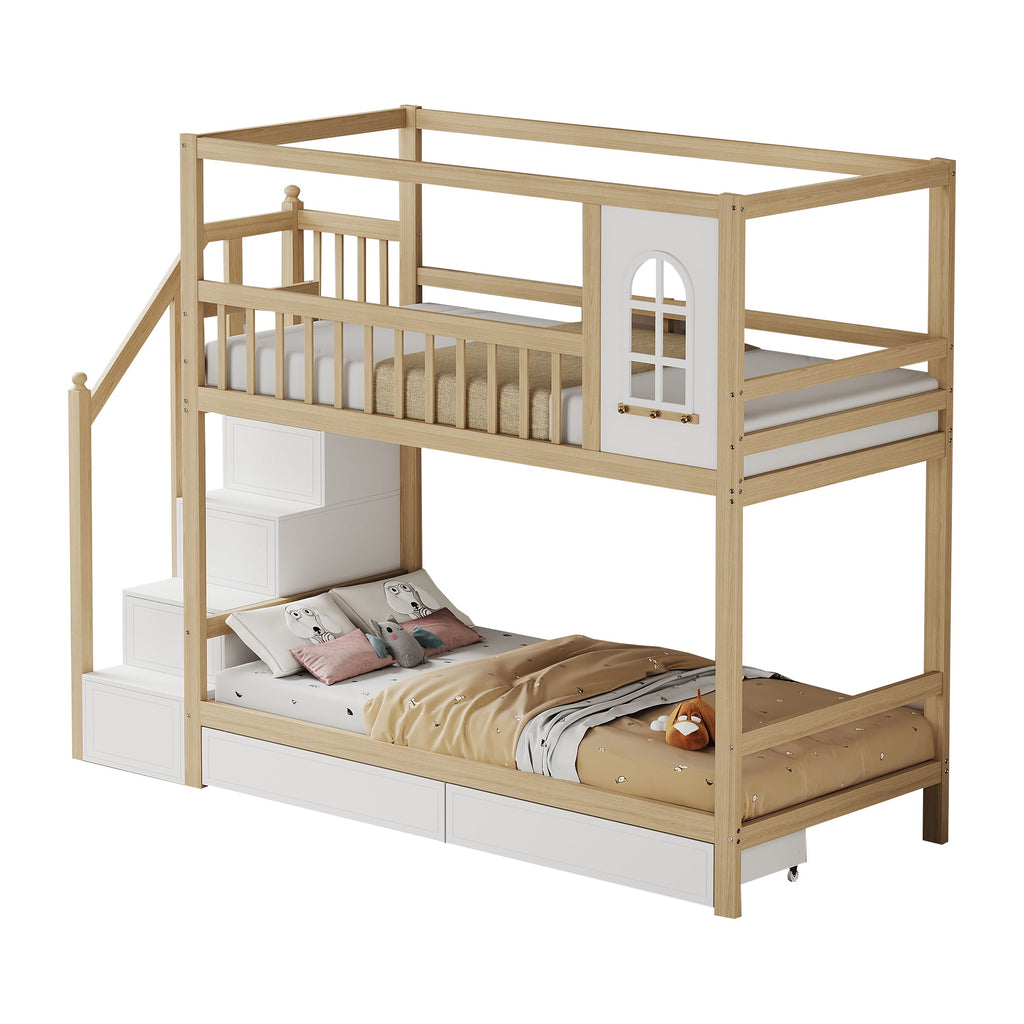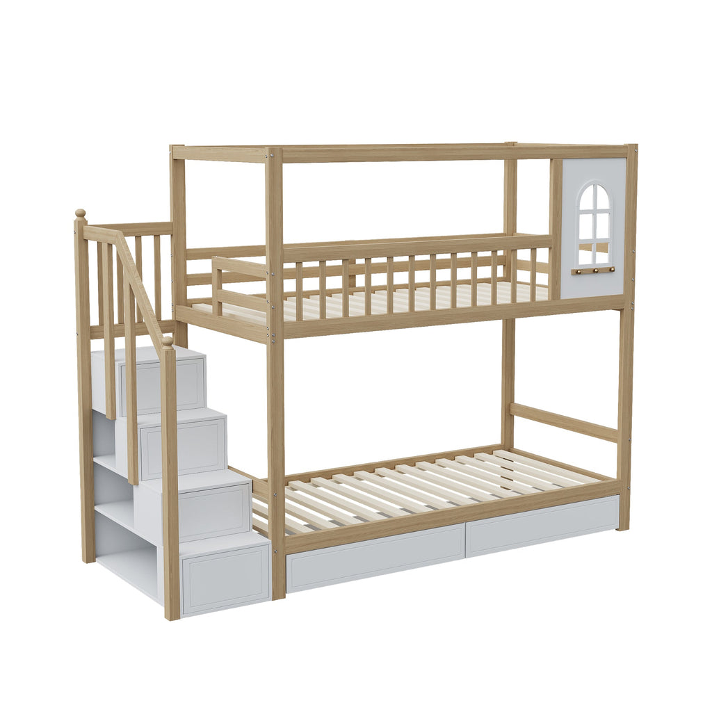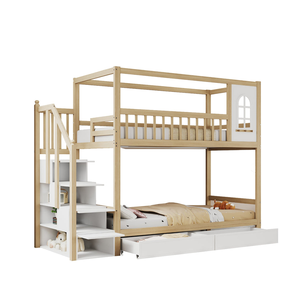 Bunk Bed, 90x200cm House Shape with Drawers & Ladder, Wood Color