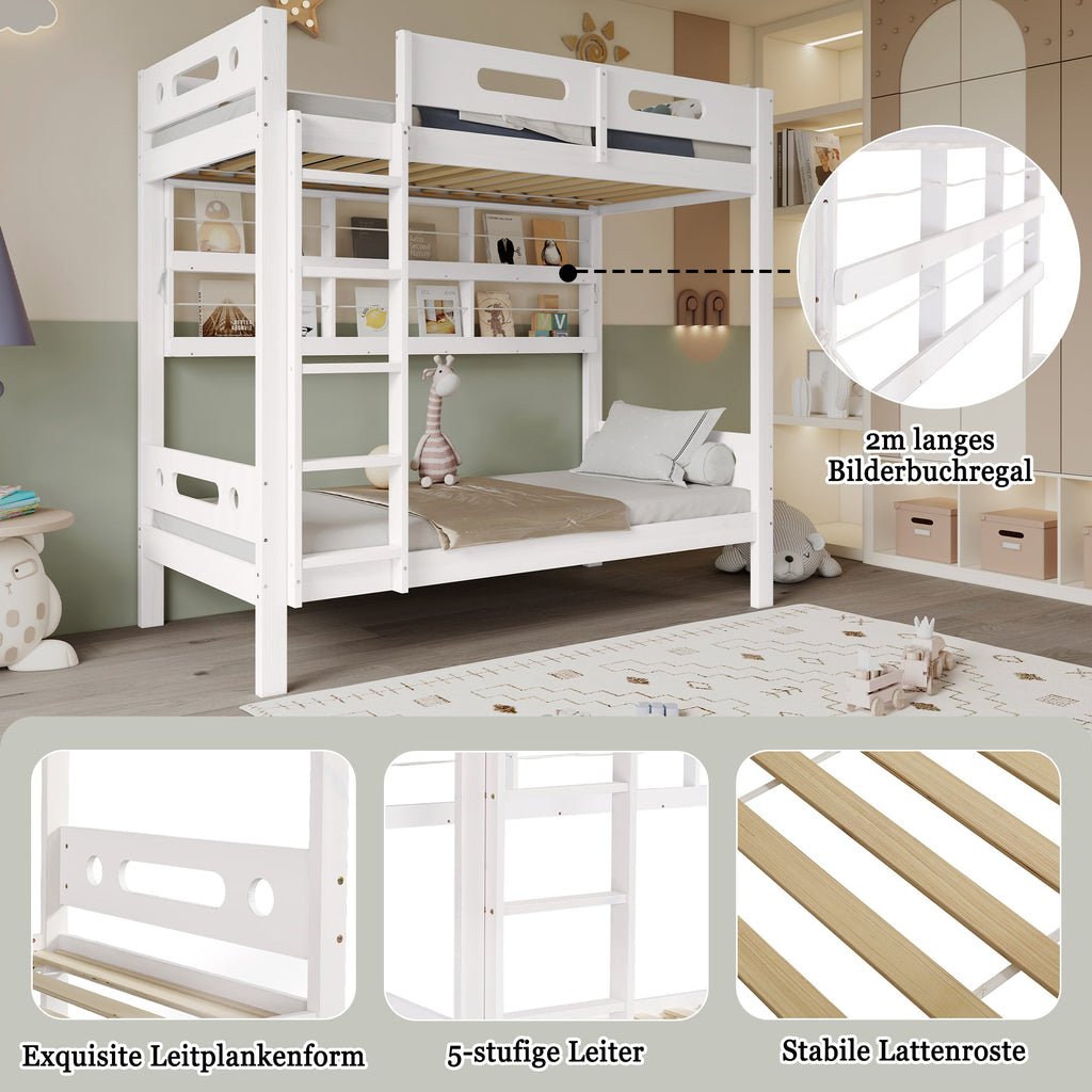 Bunk Bed, Children's with Safety Gate, Open Shelf, 5-Step Ladder, Pine + MDF White, 90x200cm