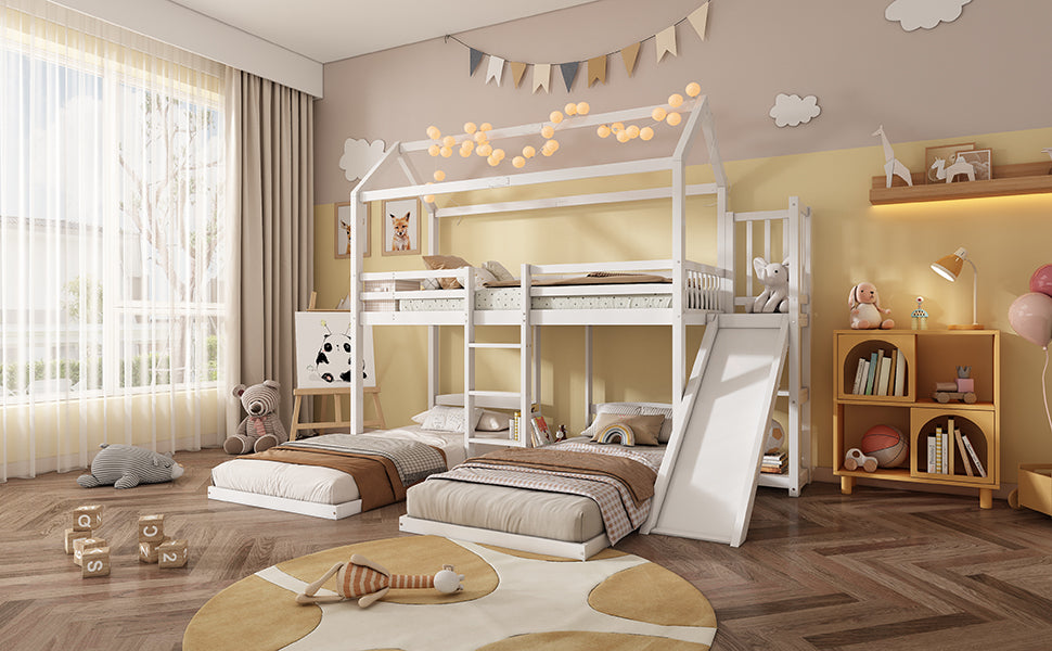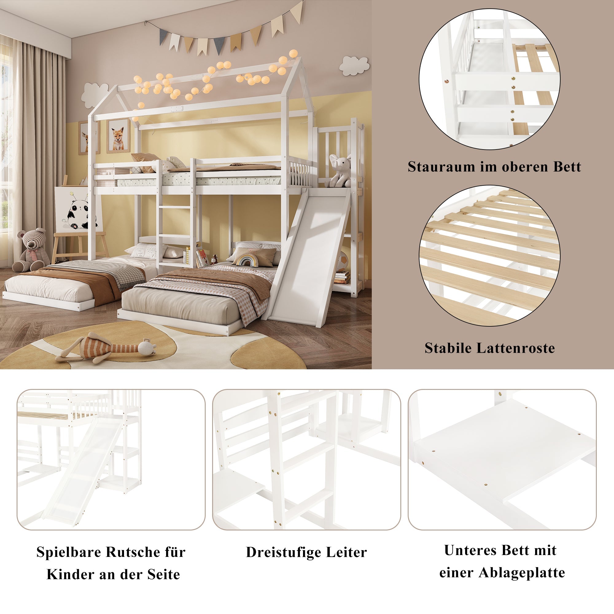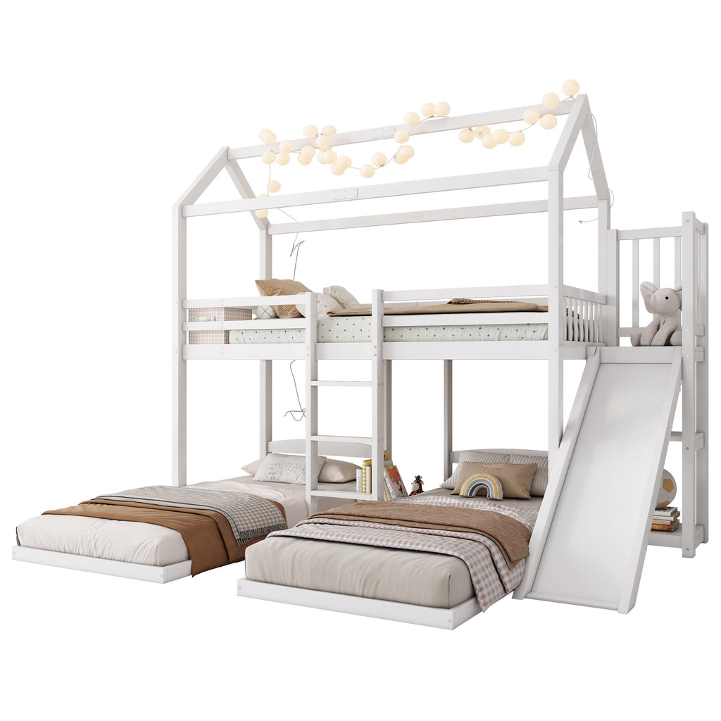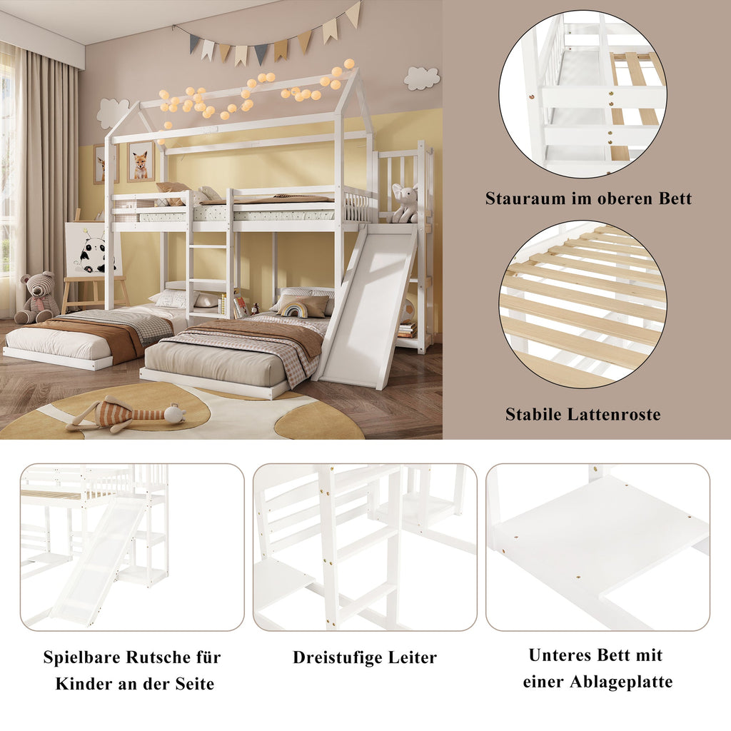 Bunk Bed, Children's with Slide, Roof Design, Three-Sleeper, Storage, Pine + MDF, White