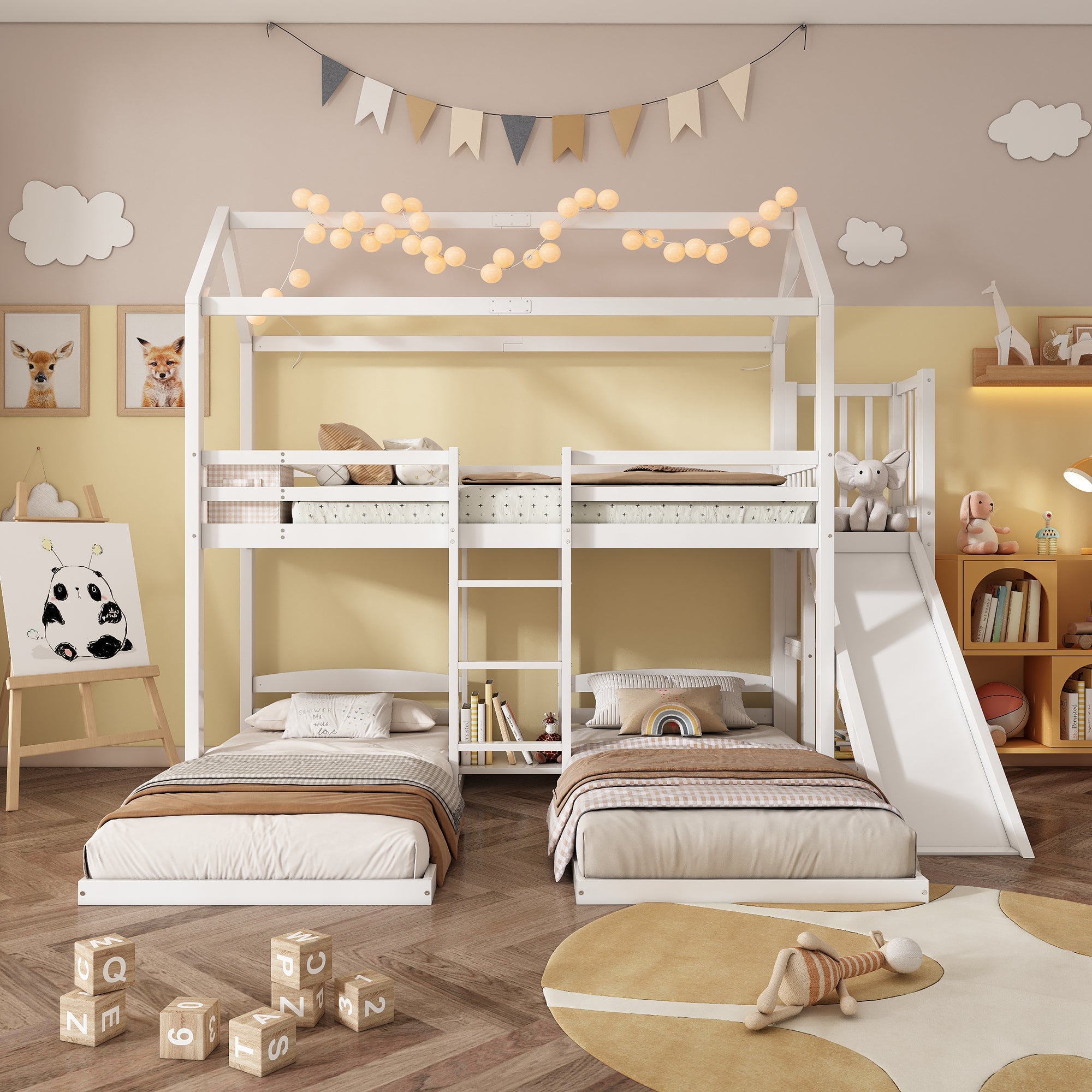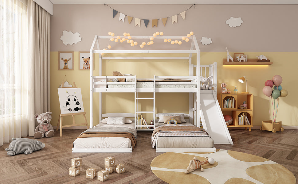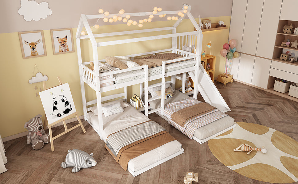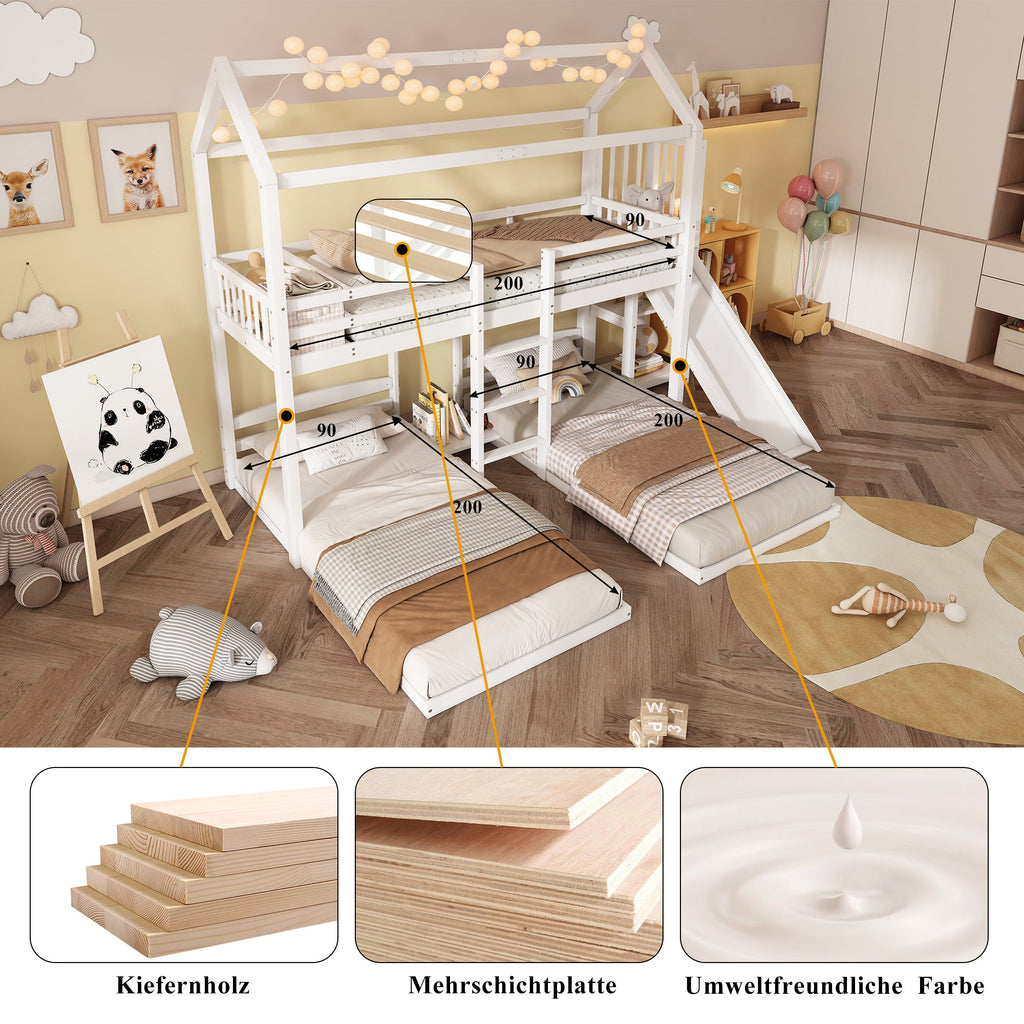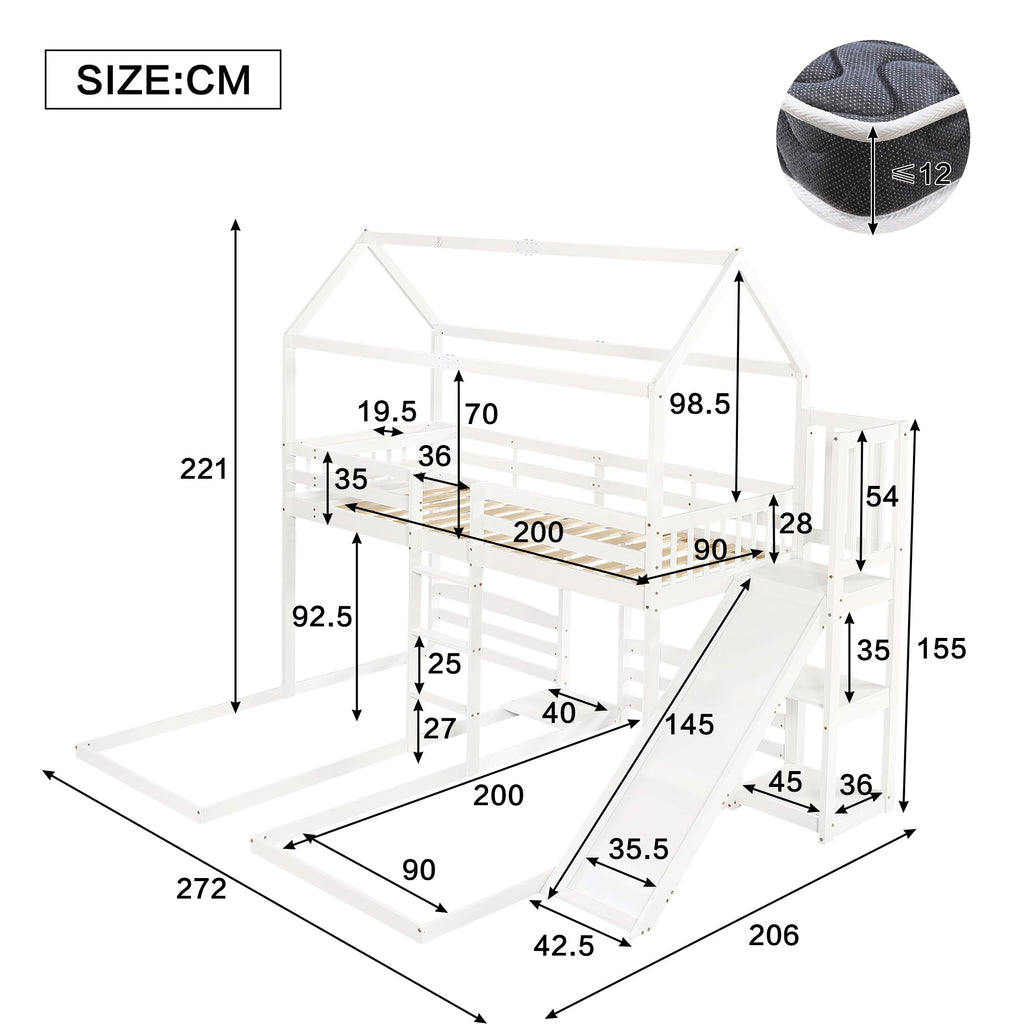 Bunk Bed, Children's with Slide, Roof Design, Three-Sleeper, Storage, Pine + MDF, White