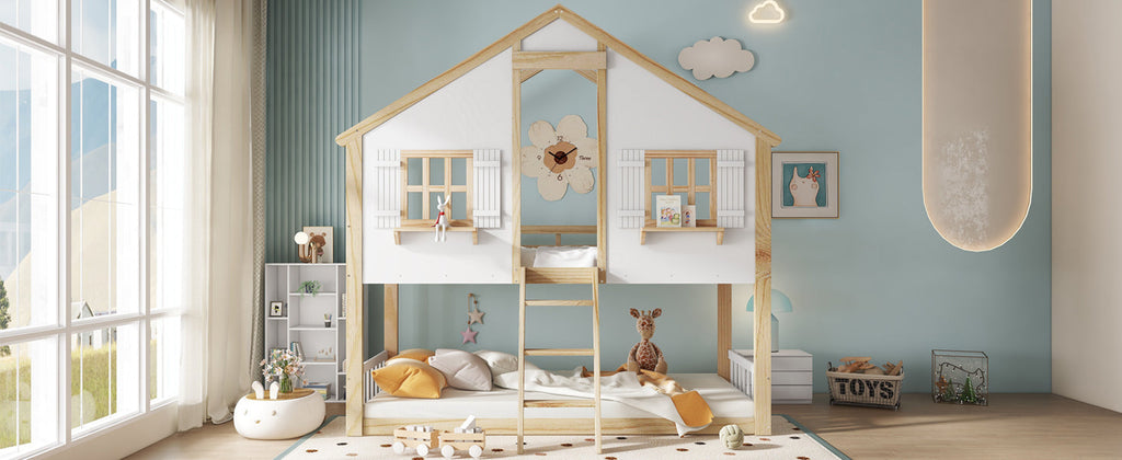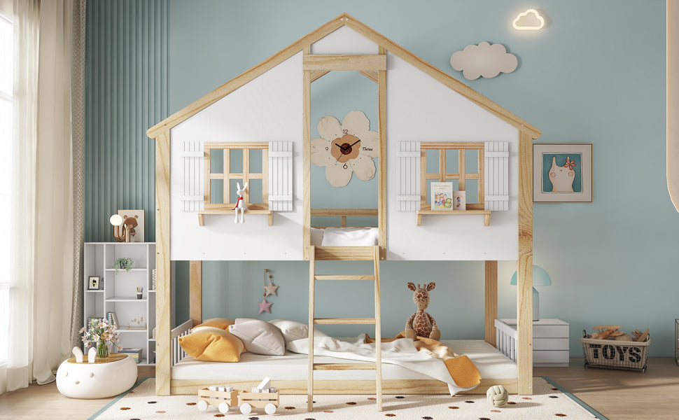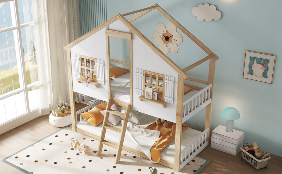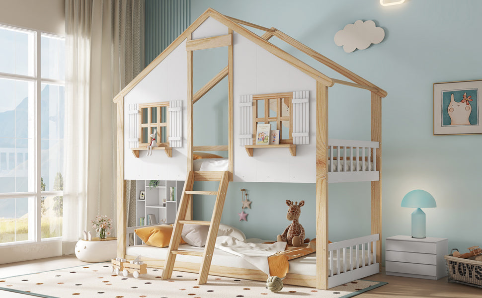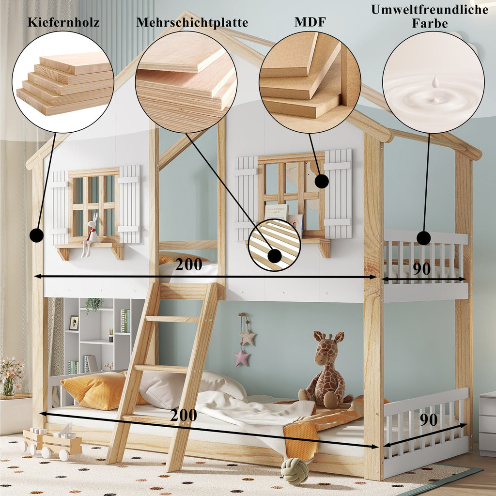 Bunk Bed, Children's Bed with Beautiful Windows and Roof, Sturdy Slatted Frame, White + Natural, 90x200cm