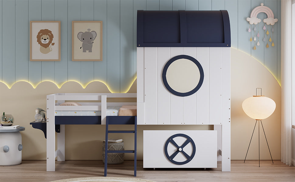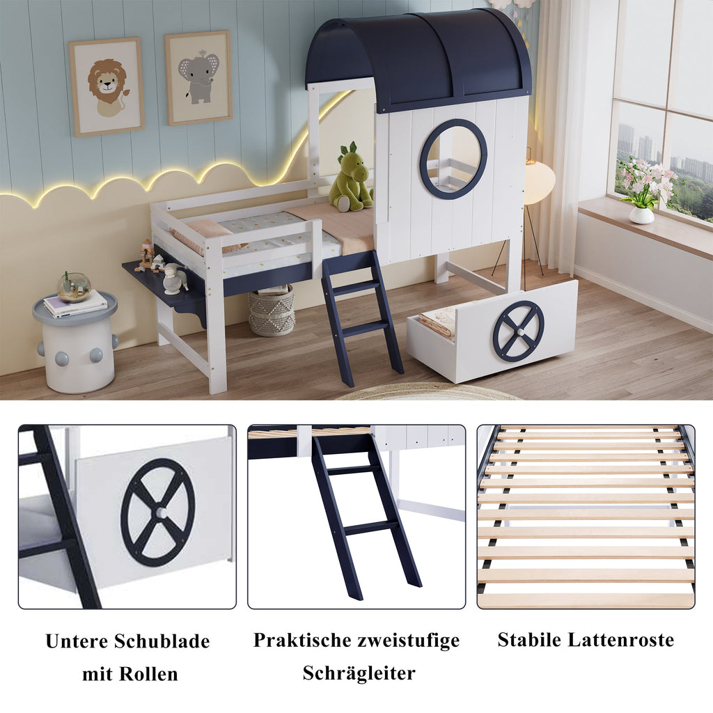 Bunk Bed, Half-Height Kids Bed with Roof, Window, Drawer & Ladder, Pine + MDF + Plywood, White + Dark Blue, 90x200cm