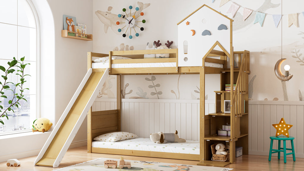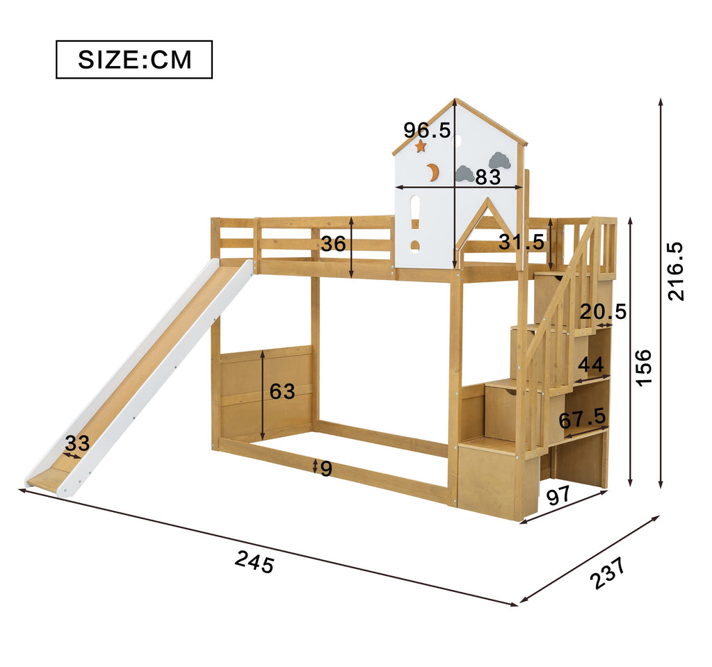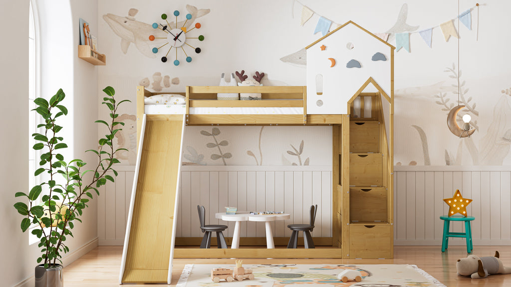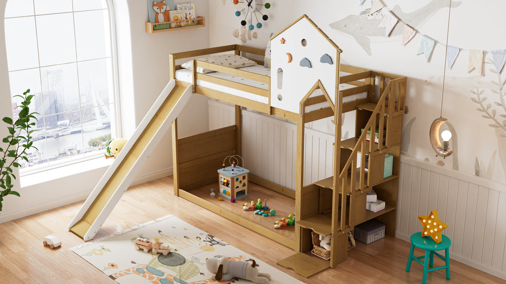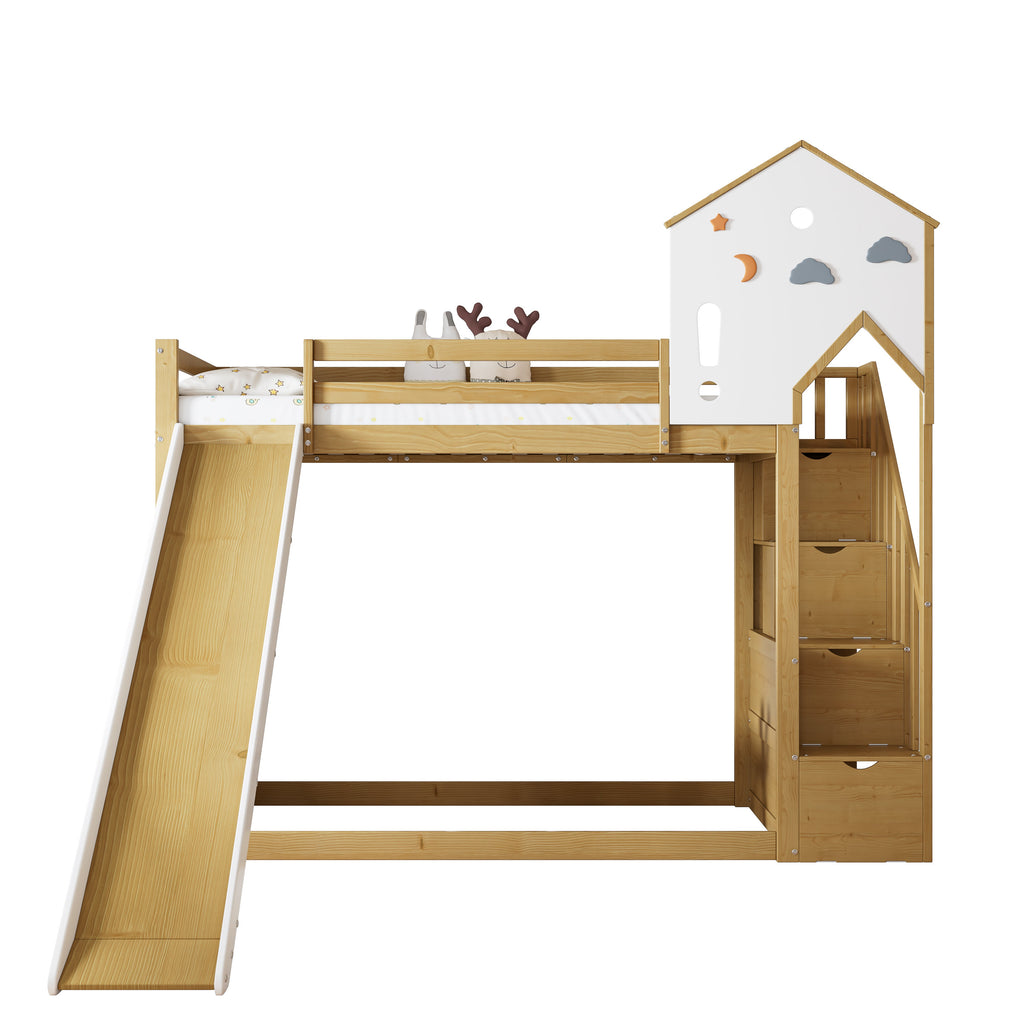This beautifully designed double bed with a slide and storage function is a dream for children. It is made of natural wood in a warm color, combined with a white roof and decorative patterns. The bunk beds have slats on the upper level and no slats on the lower level, creating a multifunctional play area. The slide ensures safe descent from the upper level, while the stairs allow for comfortable ascent and descent. The stairs also have several integrated storage compartments, ideal for storing toys and other items. The overall design is both practical and aesthetically pleasing, making it perfect for a child's bedroom or playroom.