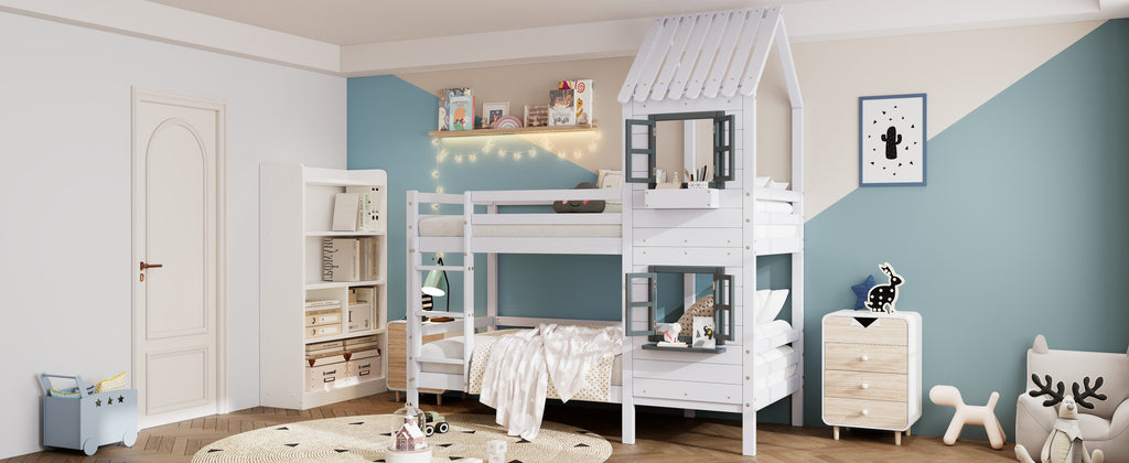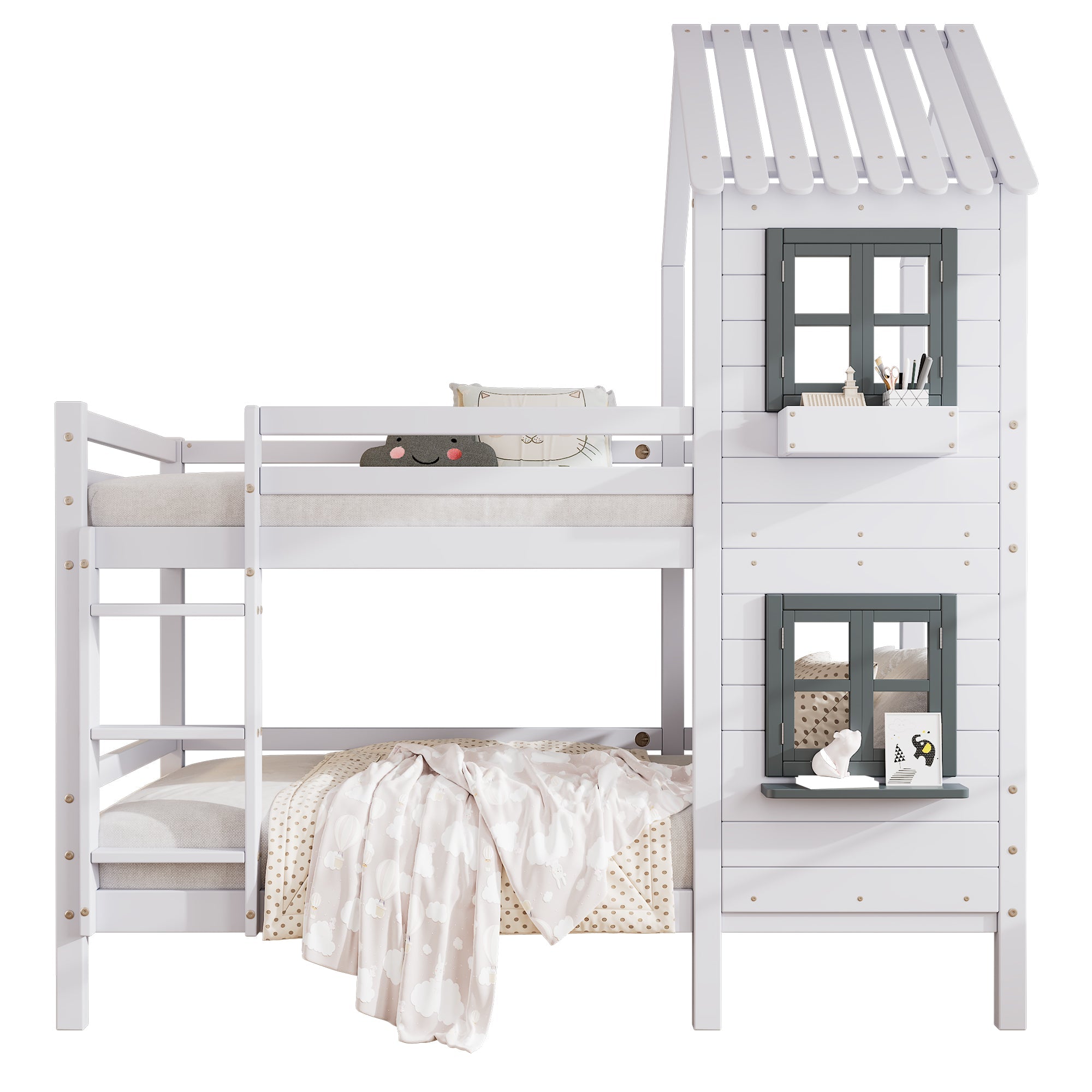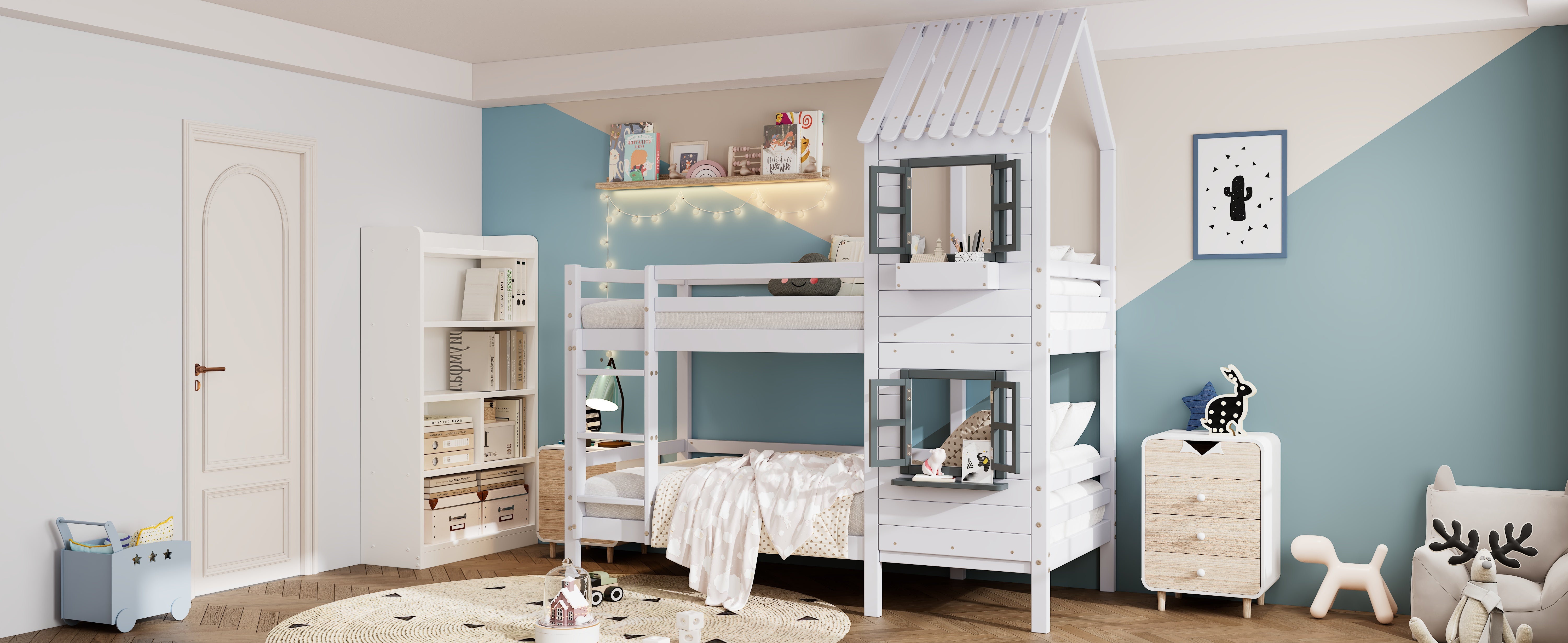 Bunk Bed, House Bed with Handrail & Window, Pine Frame, White