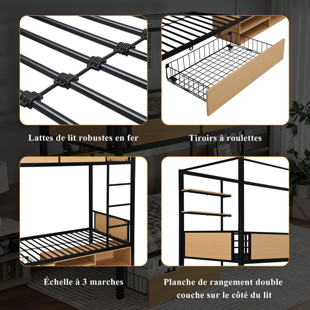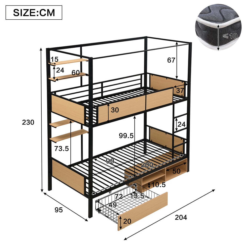 Bunk Bed, Iron Bed, Iron + MDF, Double Shelf on the Bedside, Black + Natural, 90x200