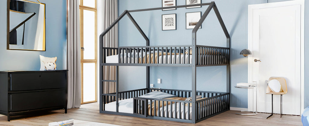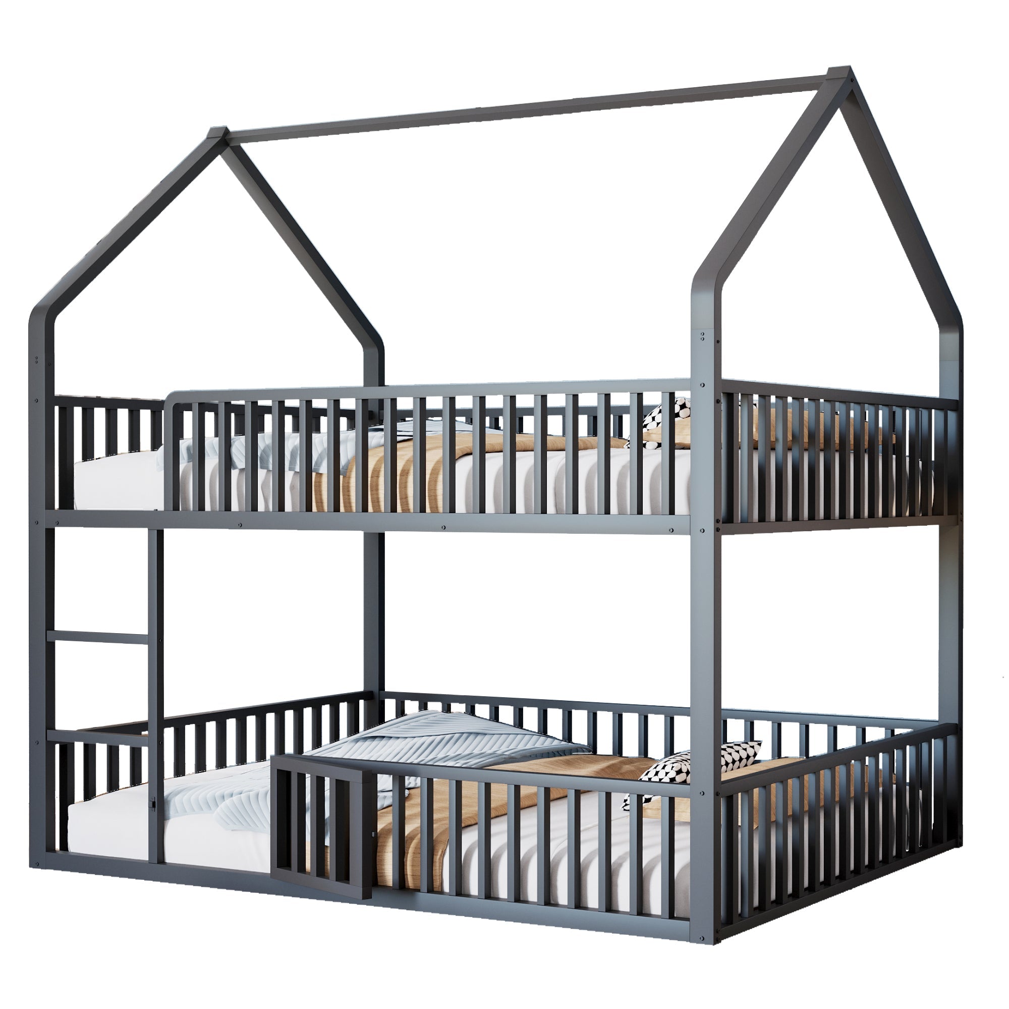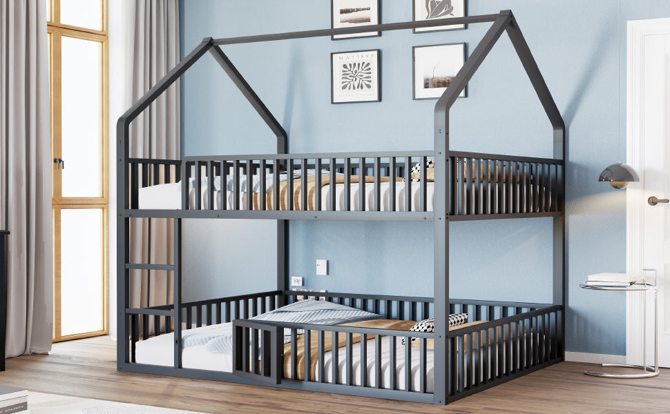 Bunk Bed, Loft Design with Stairs & Door, Black Metal
