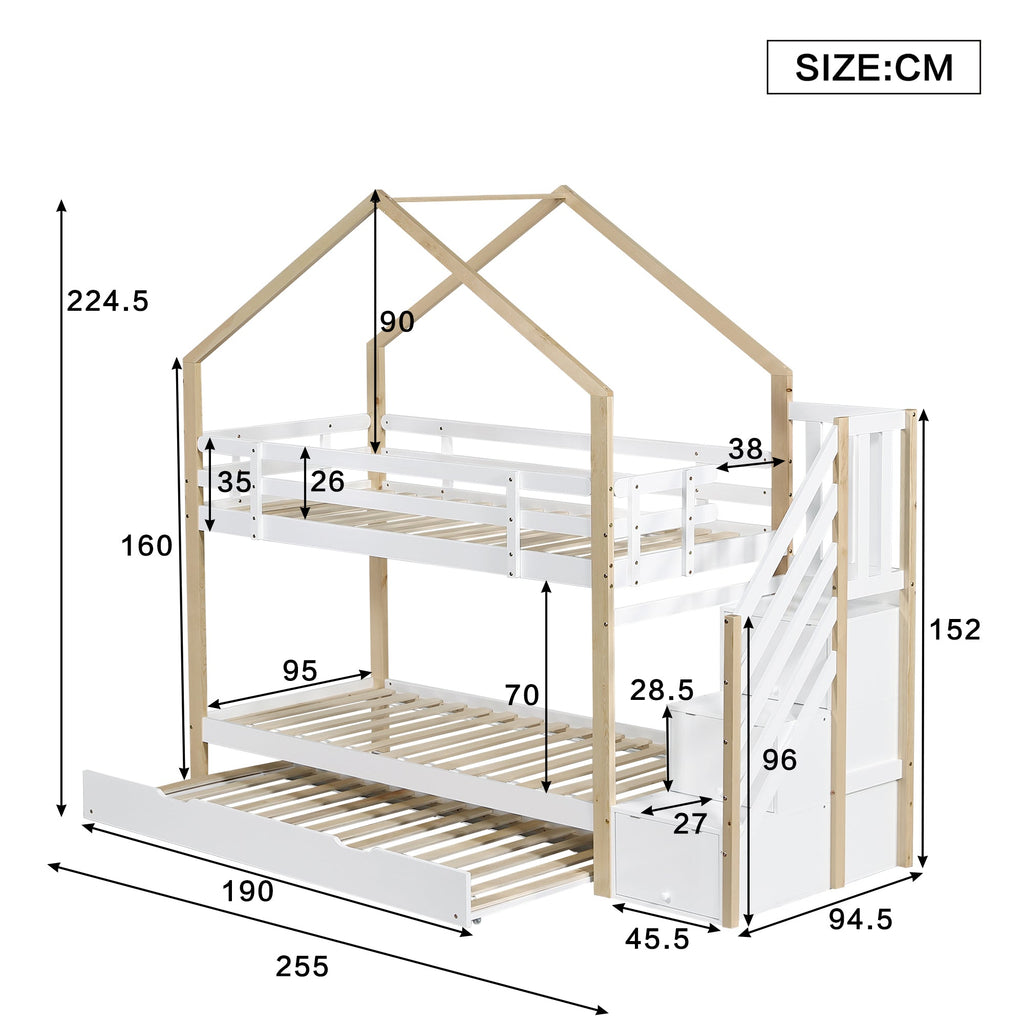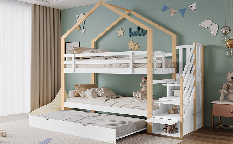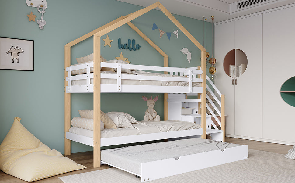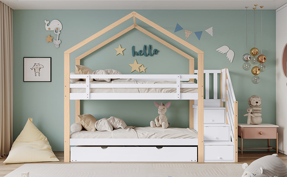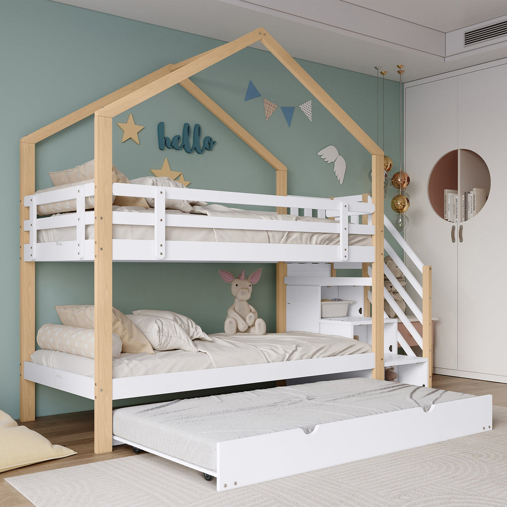 Bunk Bed, Pull-Out Treehouse with Sliding Bed & 3-Drawer Stairs, Natural + White