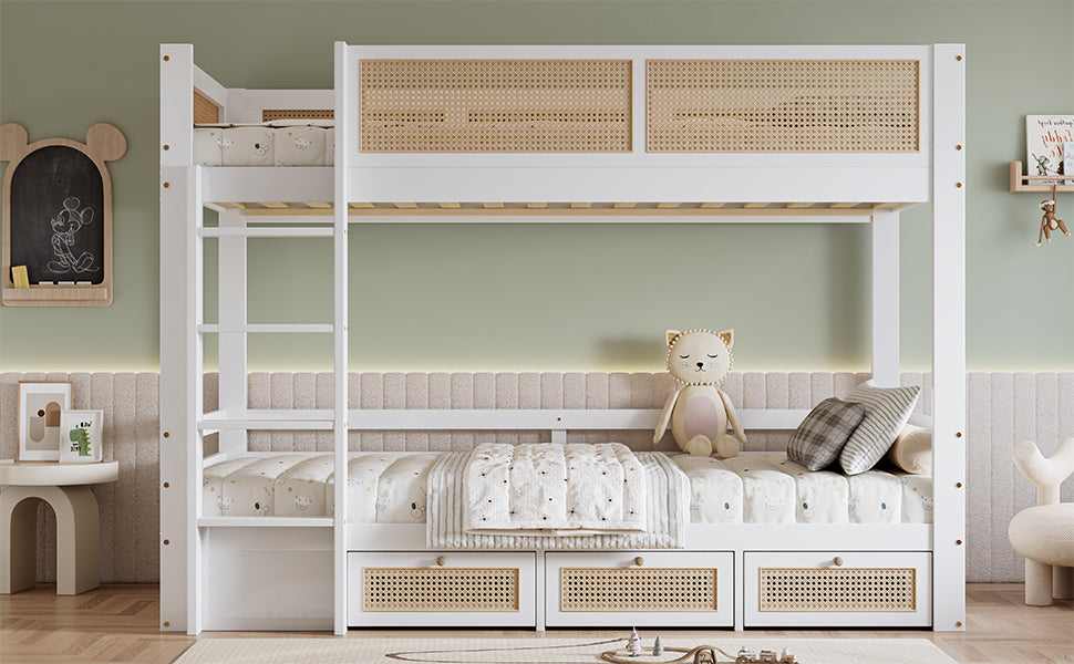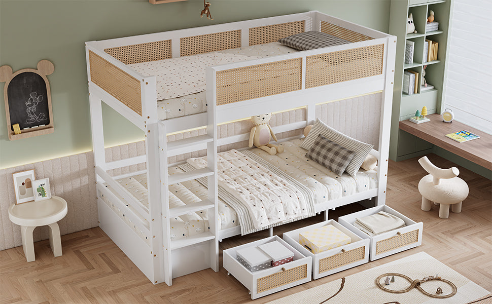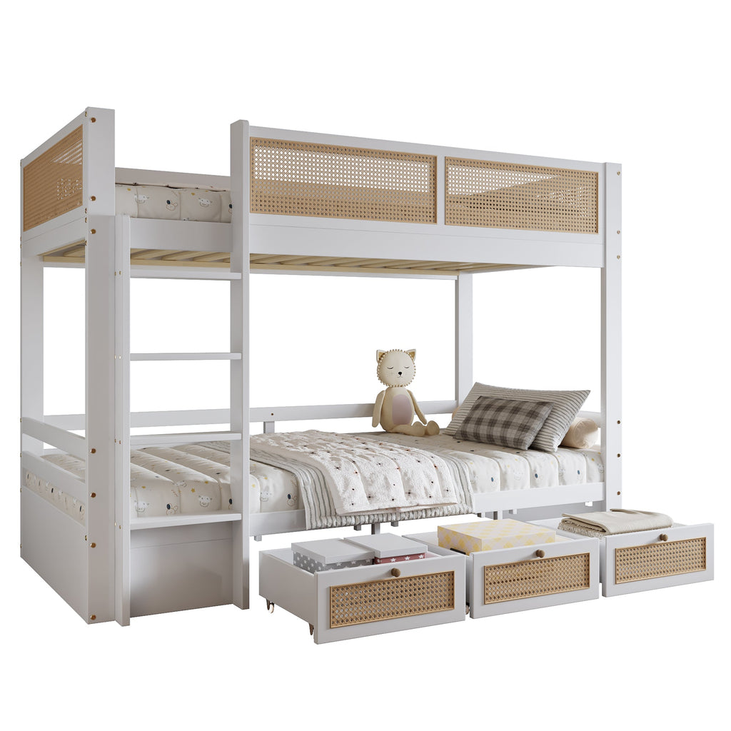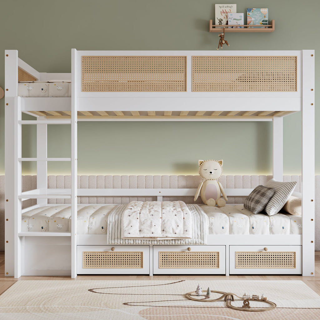 Bunk Bed, Children's Bed, Beautiful Woven Rattan Fence, Three Drawers with Wheels, White + Natural