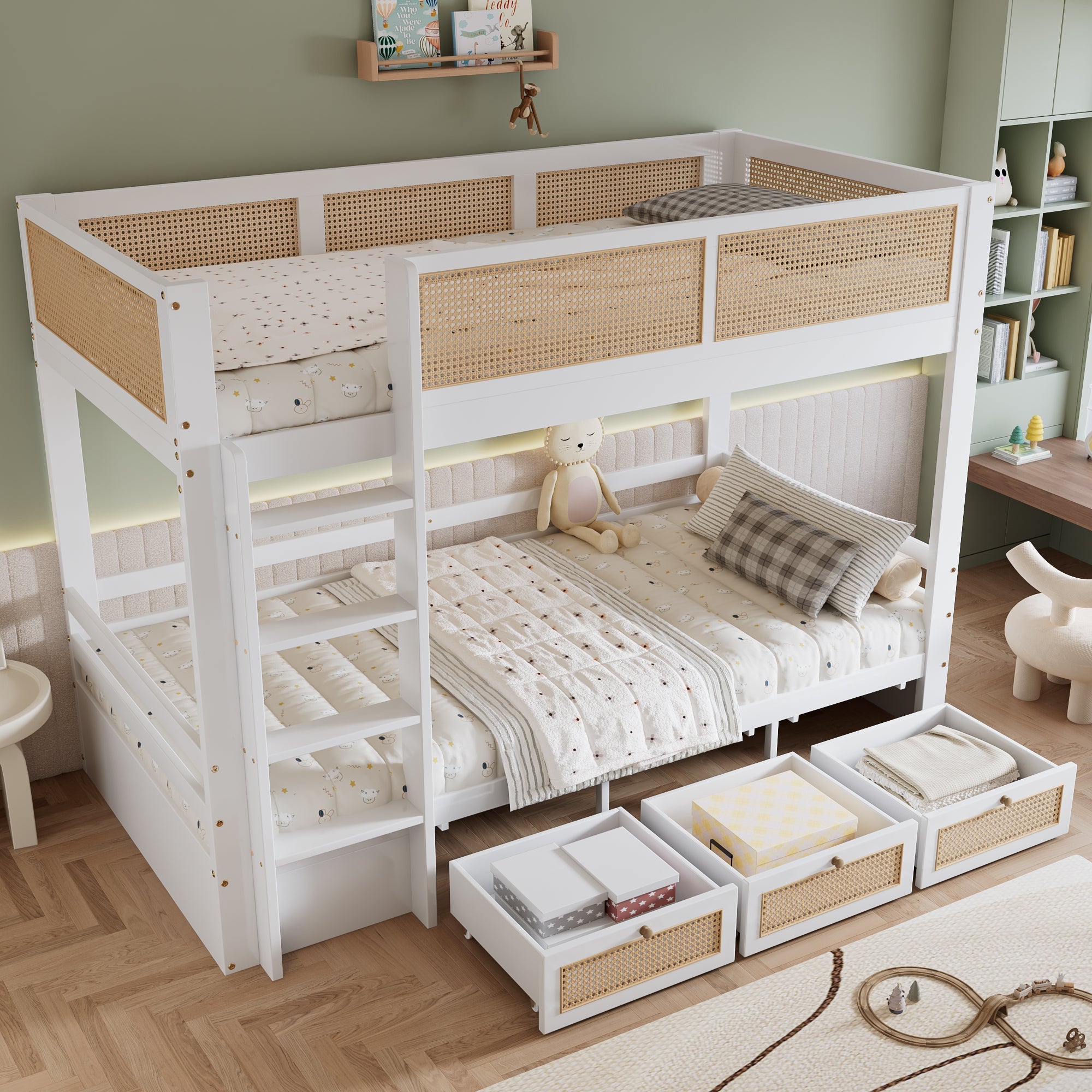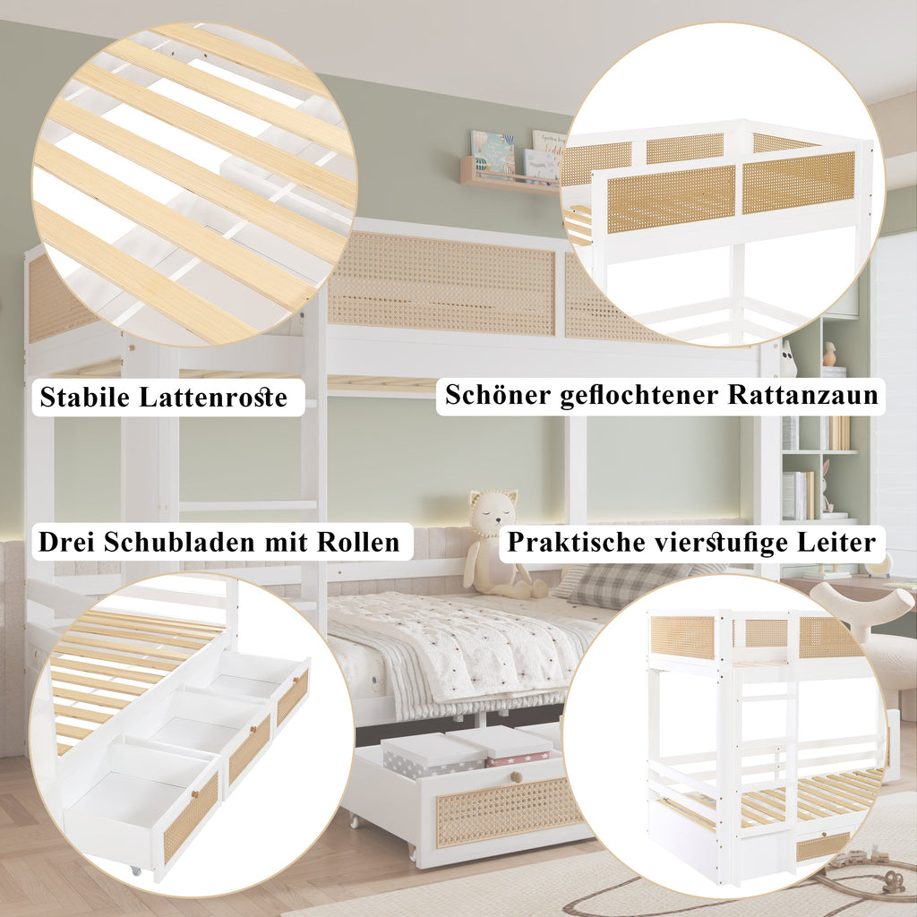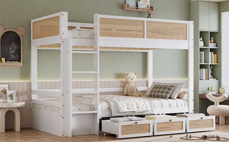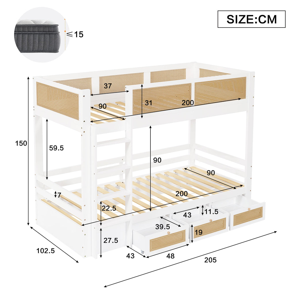 Bunk Bed, Children's Bed, Beautiful Woven Rattan Fence, Three Drawers with Wheels, White + Natural