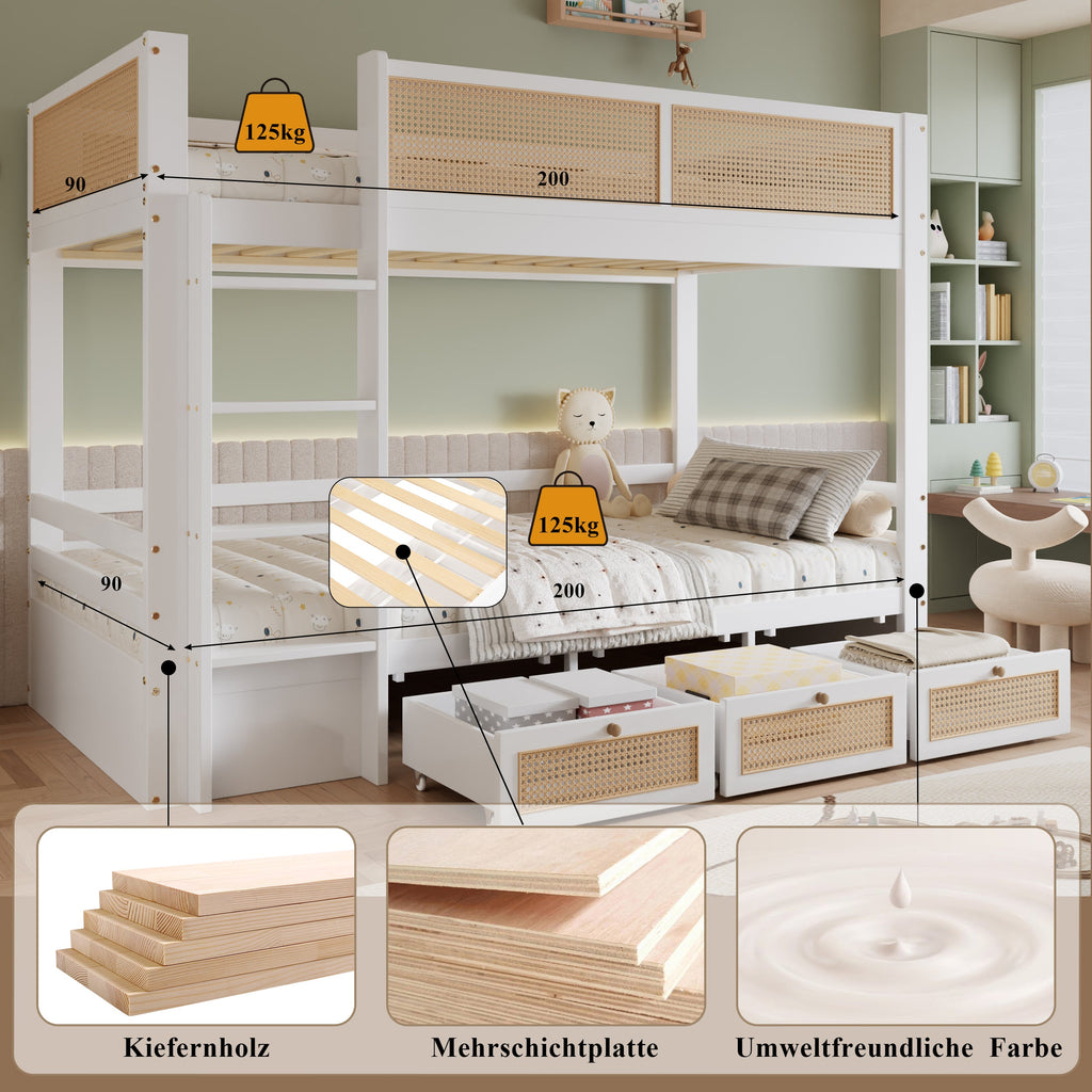 Bunk Bed, Rattan Fence with Drawers & Safe Rails, Pine + MDF + Plywood, White + Natural, 90x200cm